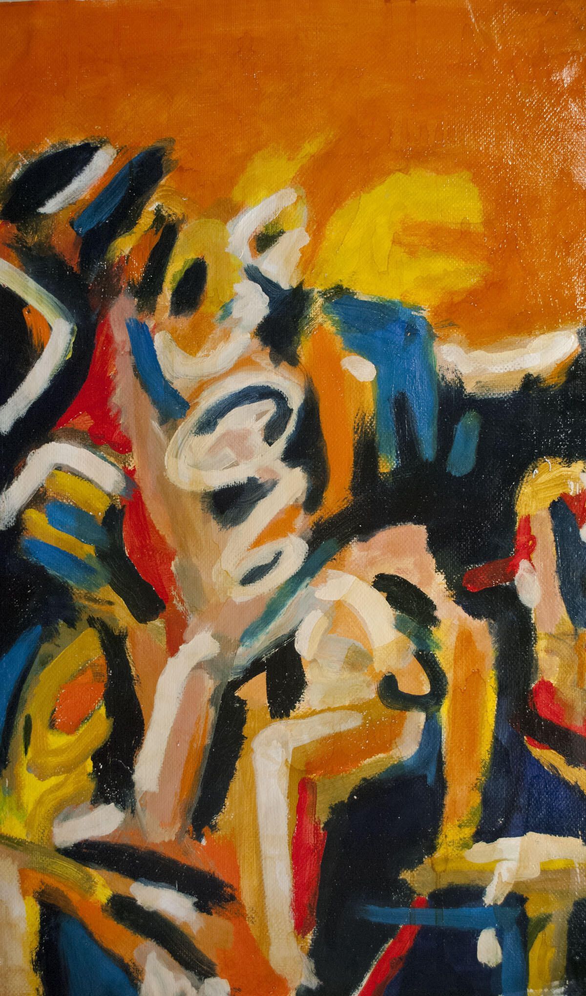 Bleed image, pinholes in each corner. Extensive paint transfer in image. Corners reinforced with canvas due to the extent of punctures. Figure?Location