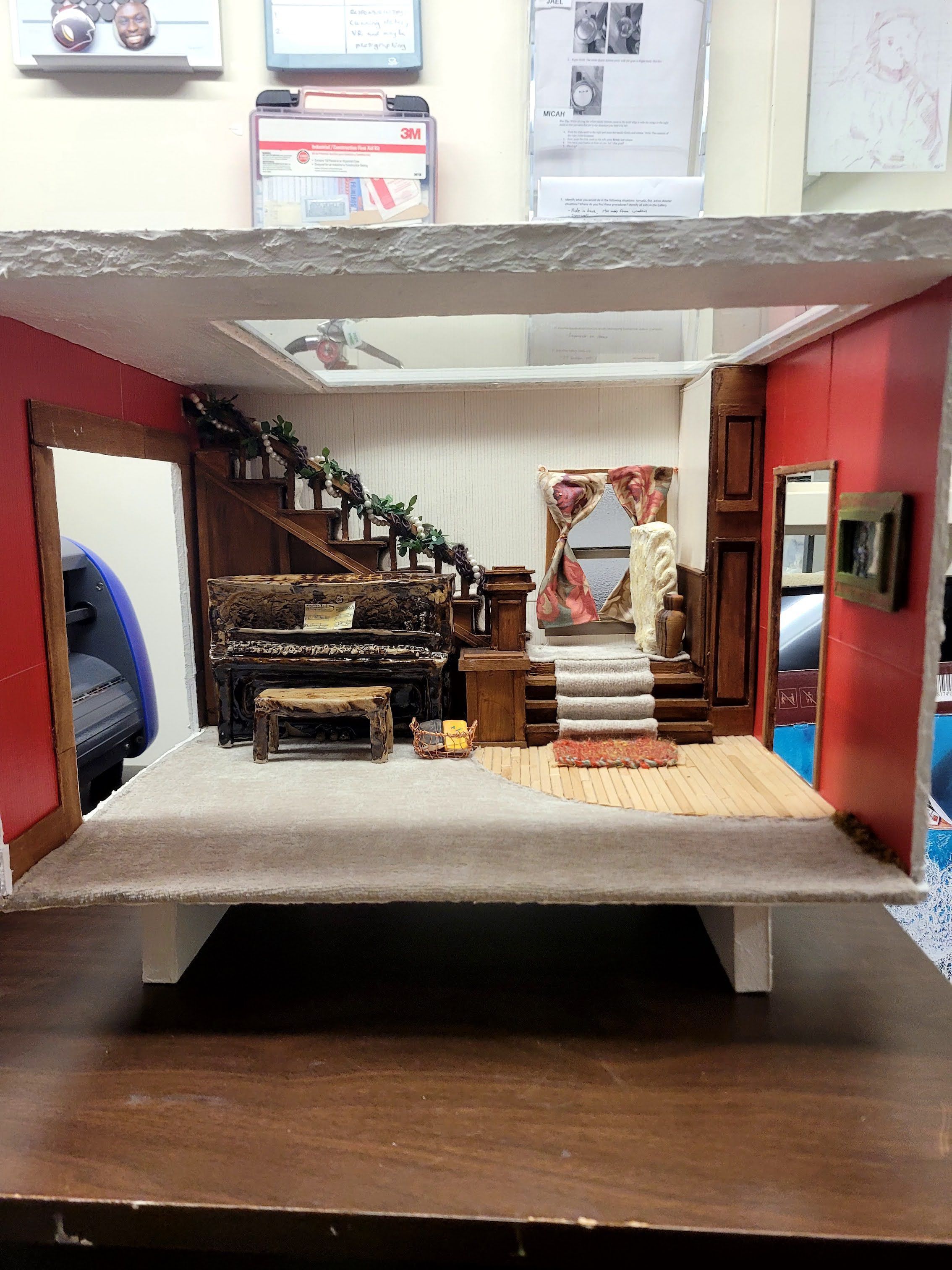 3D model of a living room, multimedia, red, brown, grey, piano, stairs, houseCollection