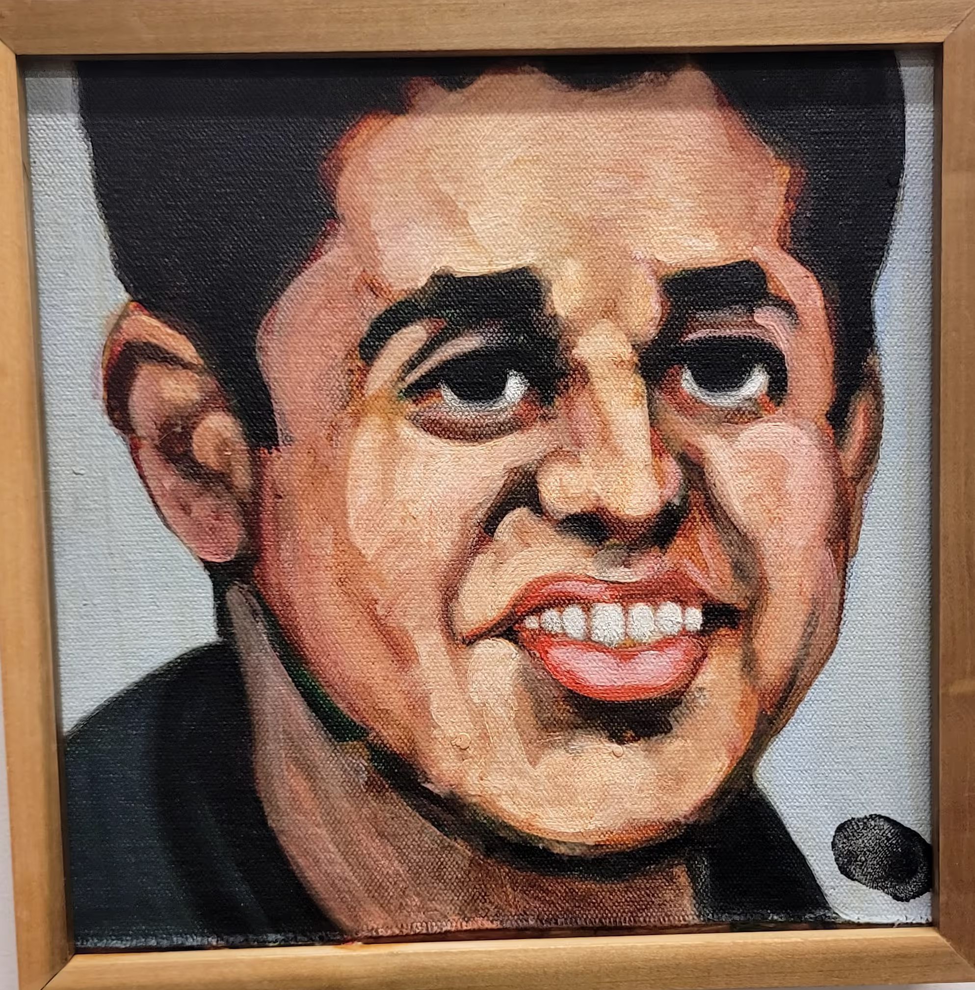 Profile of a man, few distinguishable features other than his large grimace/smile. Black fingerprint on right corner. Teal background. 9/11, teeth, human, man, black, yellow, brown, blueType of Painting