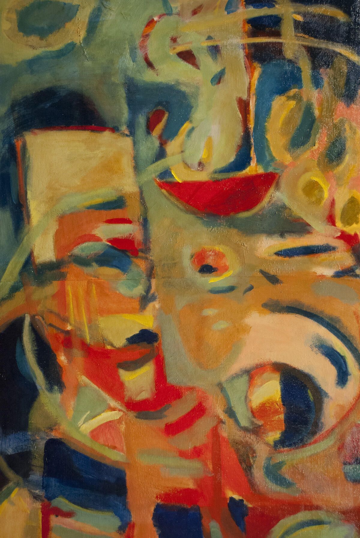 Bleed image. Tears and pinholes in corners. White paint transferred from another image in upper-right quadrant. Abstracted figure reclining?Location