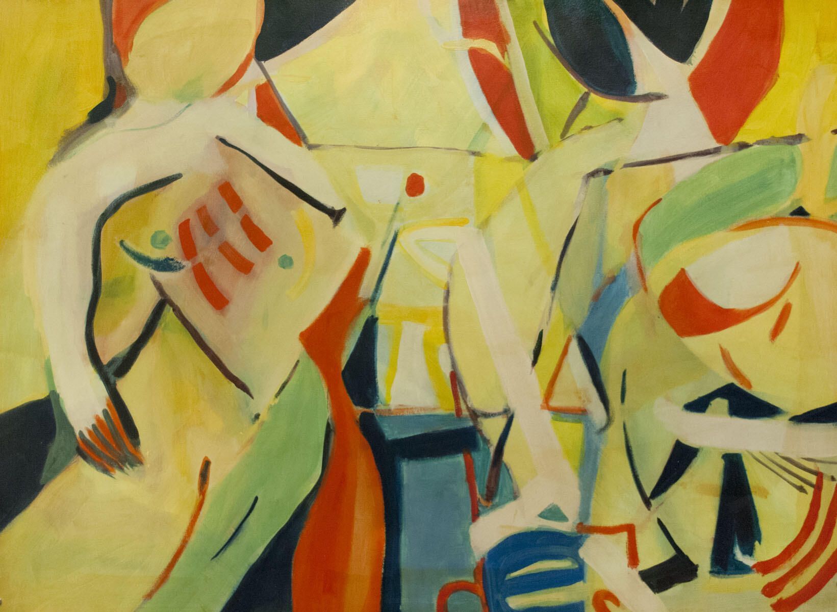 Creases, pencil marks, abrasions, smudges in borders. Image in good condition. Nude abstract/cubist figure. San Miguel series.Location