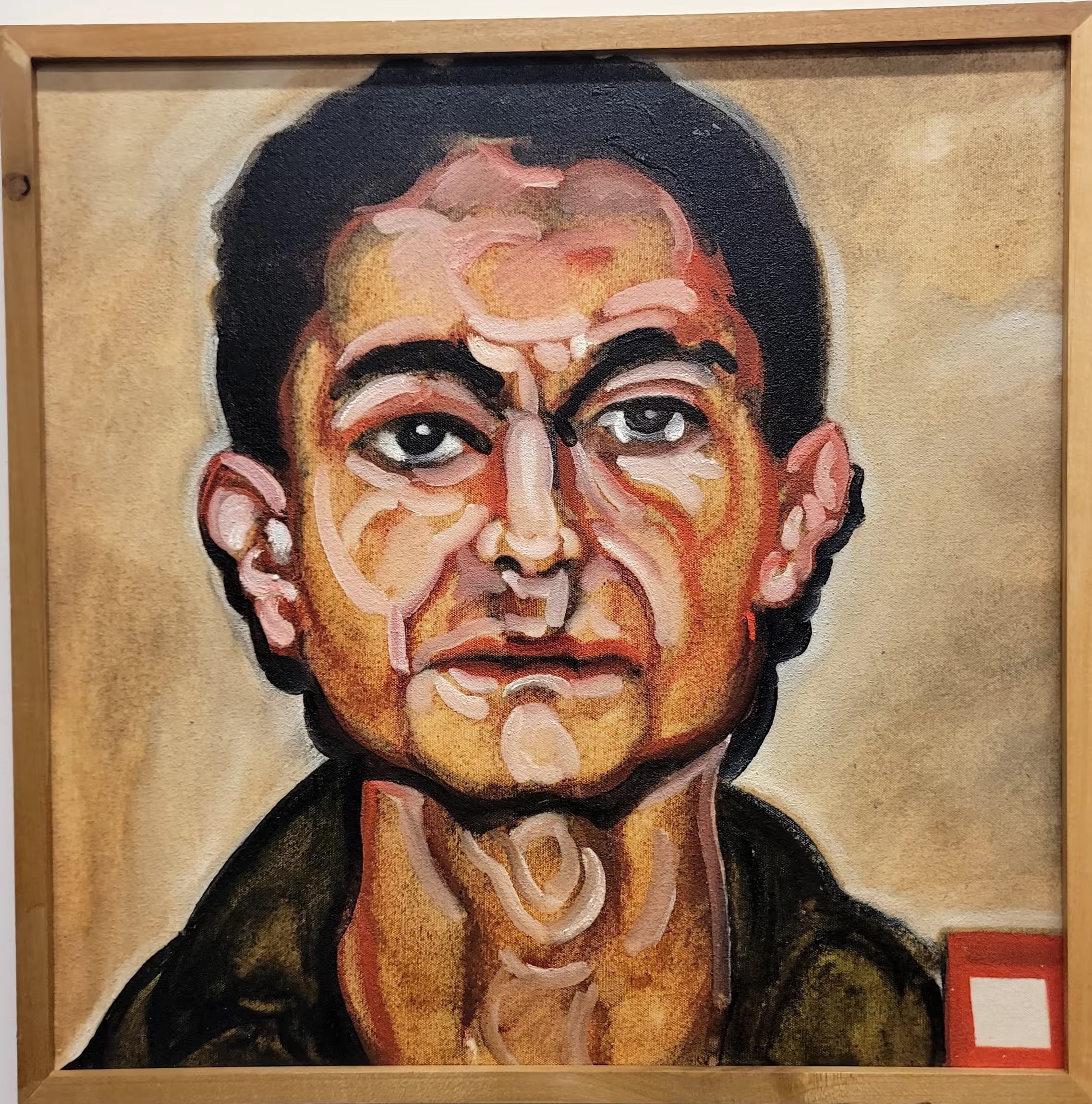 Sandy green background clean shaven wrinkled man. Green top. On right corner is a red box with a smaller white square inside of it. Lots of light. 9/11, white, pink, brown, red, black, human, manType of Painting