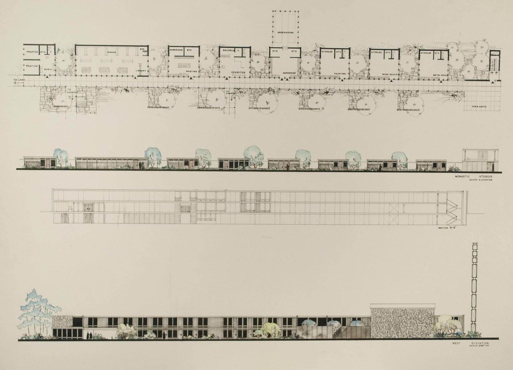Lake Andrusia Abbey. Visual arts, music, library studios. Foxing, wear in edges. Smudges, abrasions throughout.Artwork Details