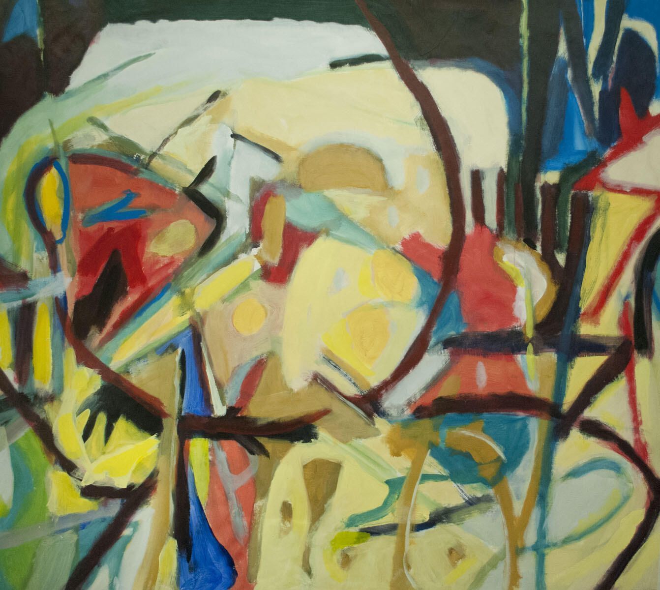 Significant tears at bottom repaired by artist with small pieces of paper glued to back of image with acrylic medium. Smudges, pencil marks in borders. Abstract composition. Lynn Street series.Dimensions