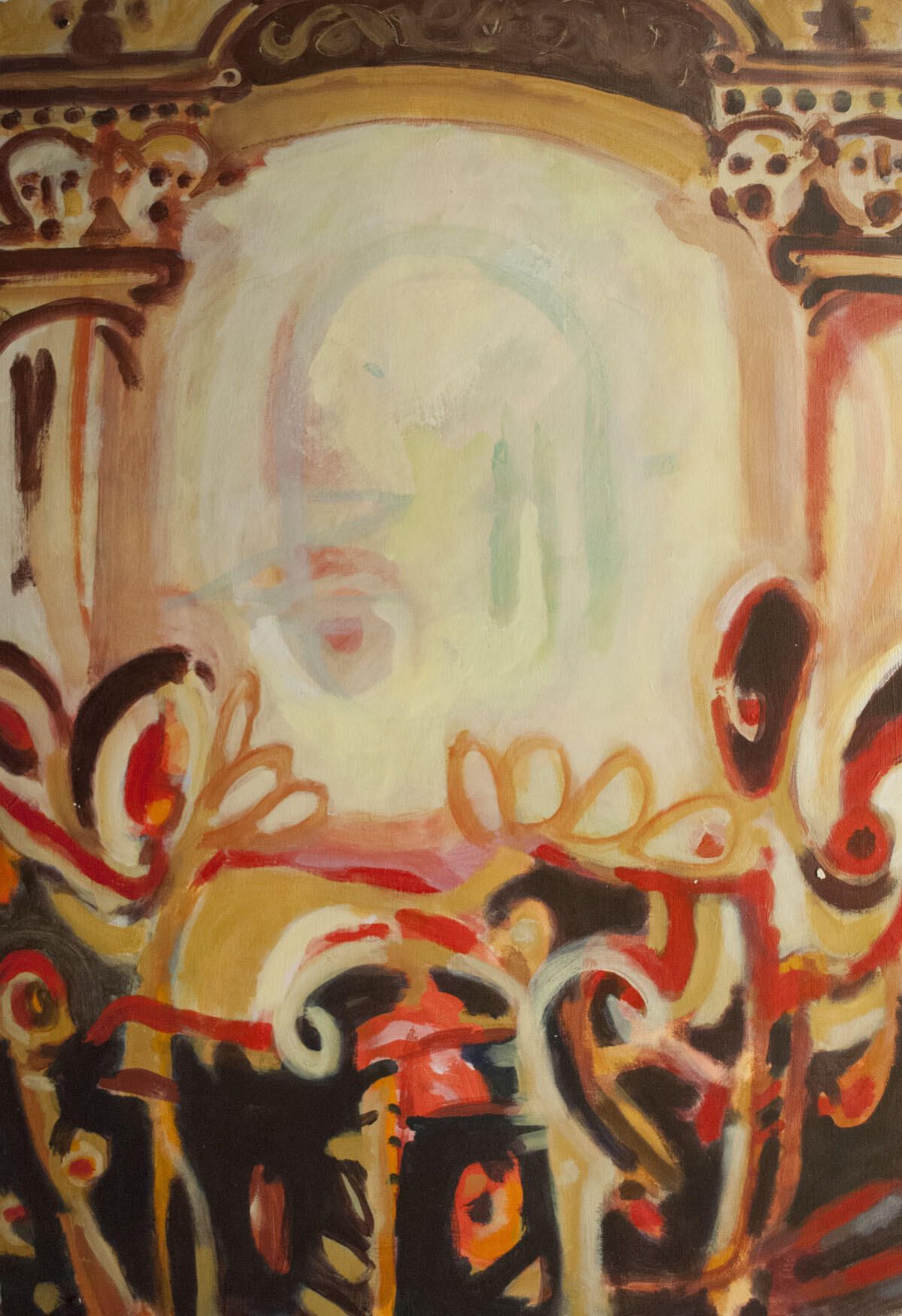 Abrasions, one affecting image in top-left corner, smudges in borders. Paint chips adhered to image, some paint transfer. Interior scene, opera house. Viterbo series. portal, white, orange, brown, redDimensions