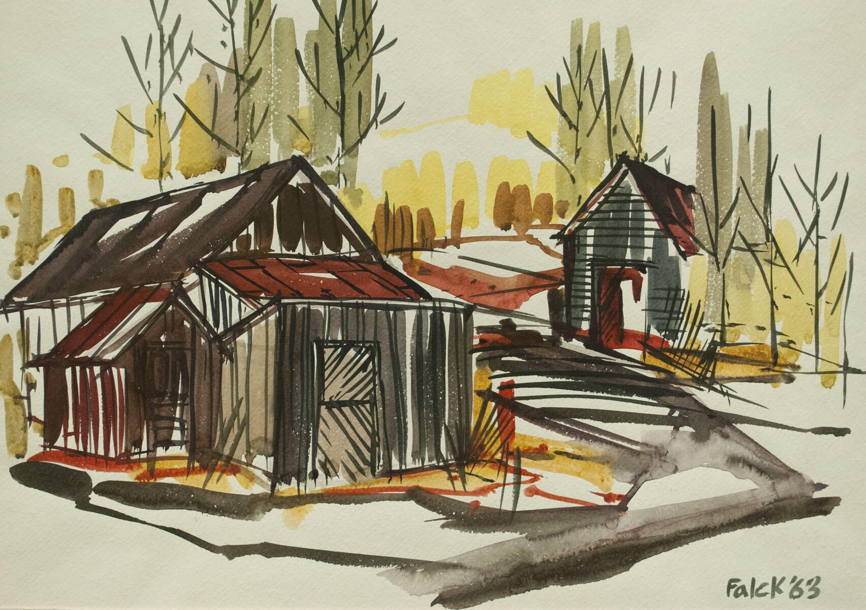 Light foxing at top of image, poorly matted with masking tape. Landscape - architectural study.Location