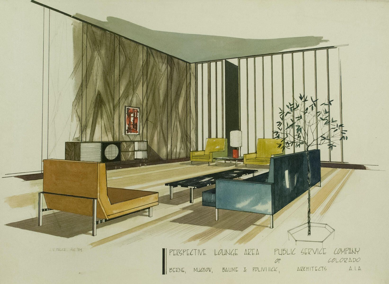 Smudges, borders foxed especially at corners. Interior rendering of proposed waiting room for Berne, Mucha, Baume, Polivinisk Architects.Artwork Details
