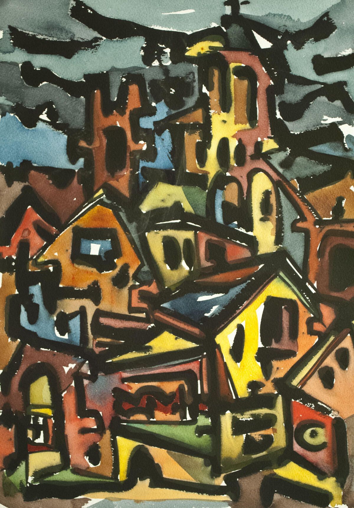 Poorly matted with masking tape, non-archival mat board. Image in good condition. Cityscape.Location