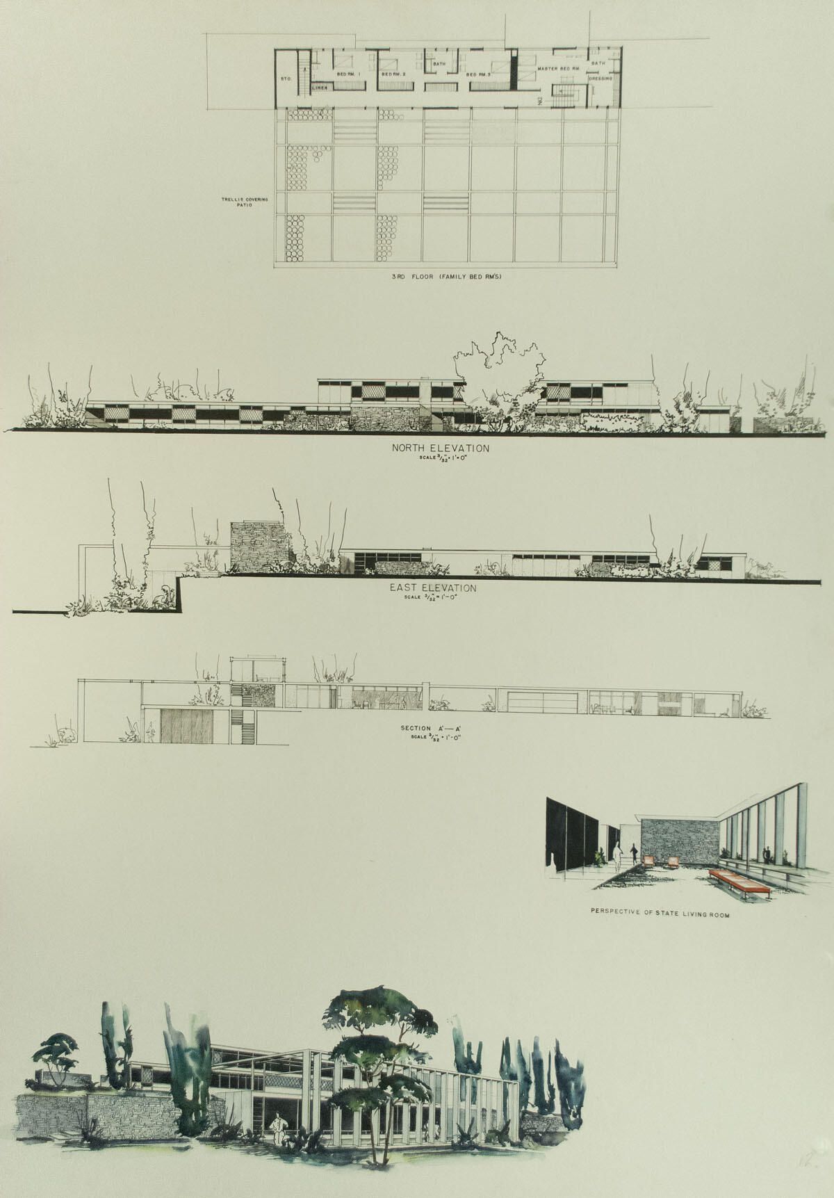 3rd floor plan, North and East elevations. Smudges throughout image, foxing and wear in borders.Artwork Details