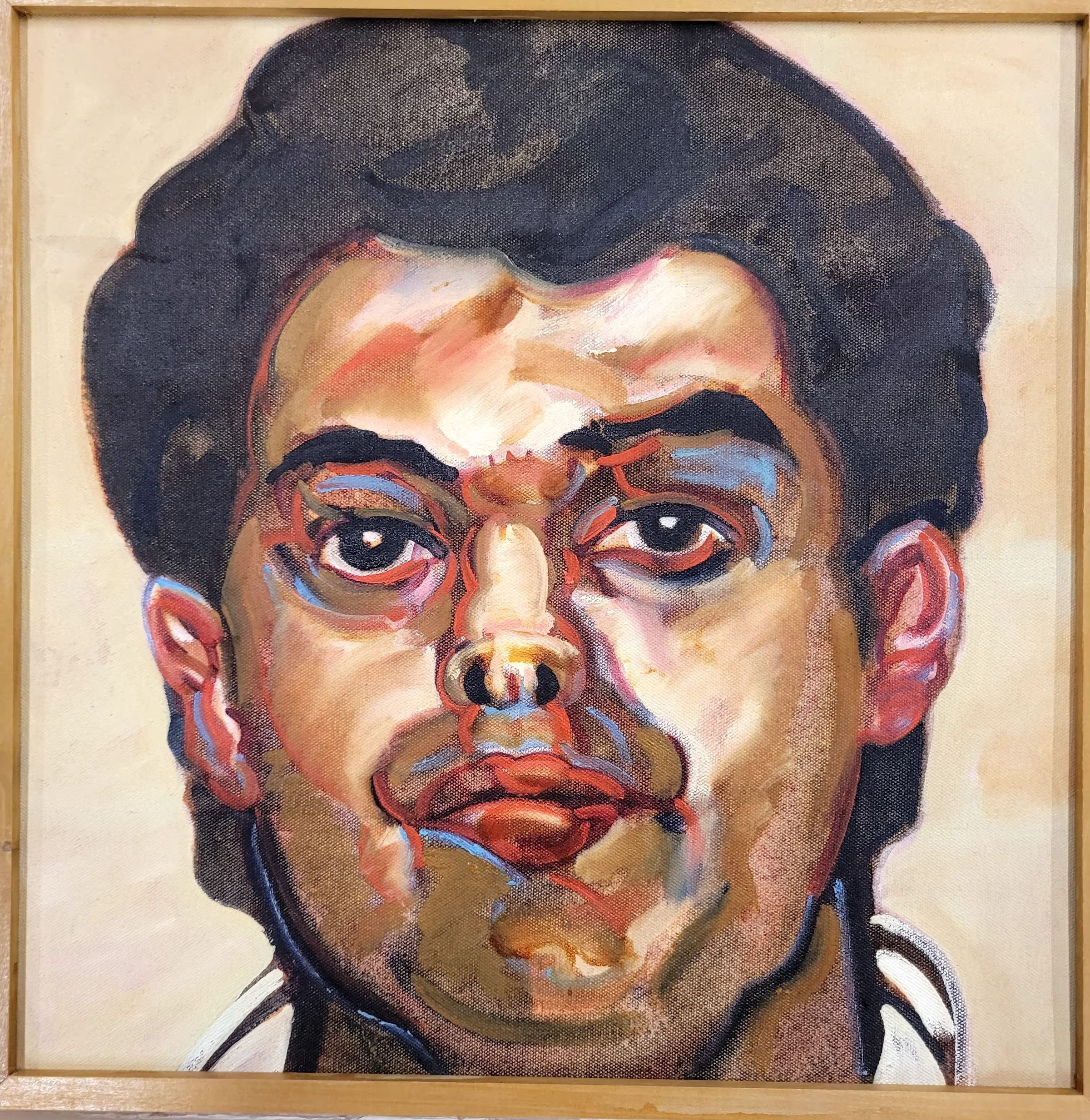 Sandy tan background. Man with black hair and deep eye bags stares straight ahead. Lots of bright blues and reds in the face. 9/11, black, pink, blue, 9/11, humanType of Painting
