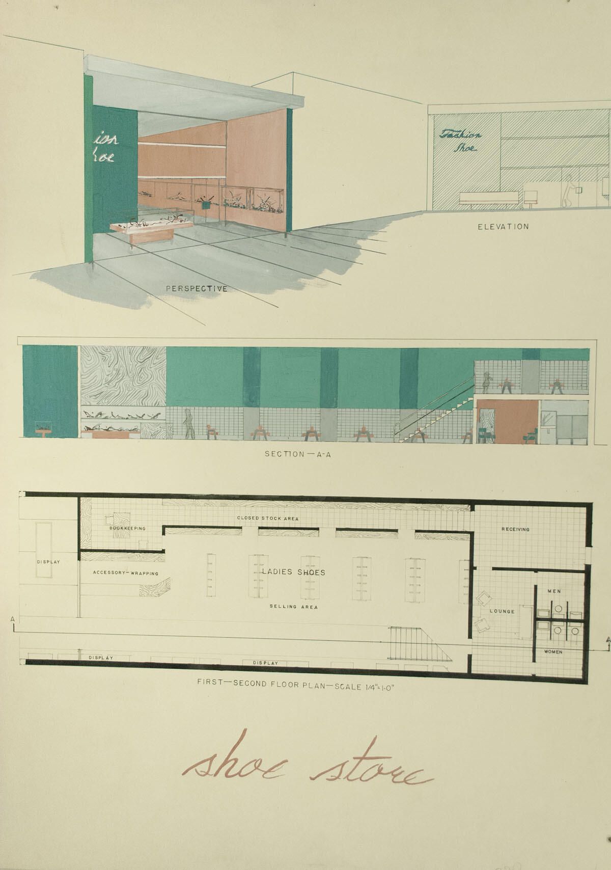 Elevation and floor plans for proposed shoe store. Foxing, wear in borders.Artwork Details