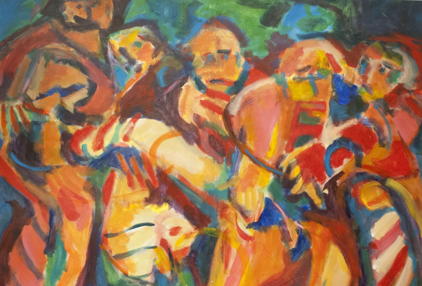 Two sheets adhered together to form larger image area. Pinholes in each corner. Smudges in borders. Small points of pigment transferred from another work throughout image, otherwise image in good condition. Group of male figures. Mateus series.Dimensions
