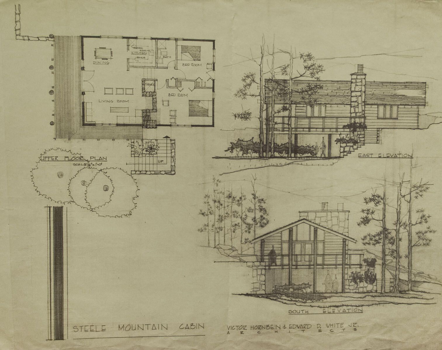 Upper floor plan, south and east elevation. Several small tears in top and bottom edges.Artwork Details