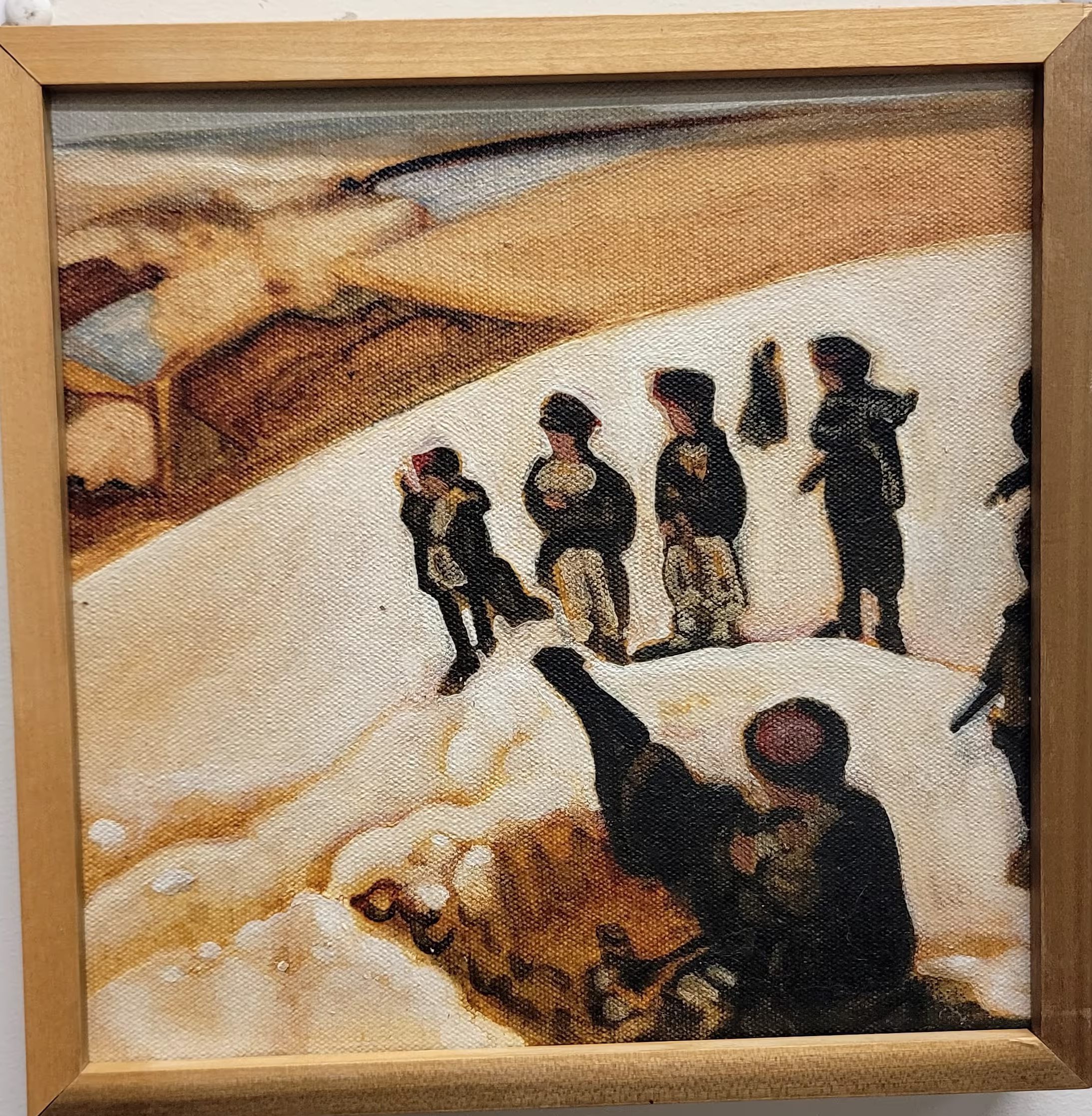 Desert. One figure in red hat in the right corner. Four figures center frame. 1 small figure behind them. On the right side figures are cut off. Sand, soldiers, war, 9/11, brown, white, black, human, historyType of Painting