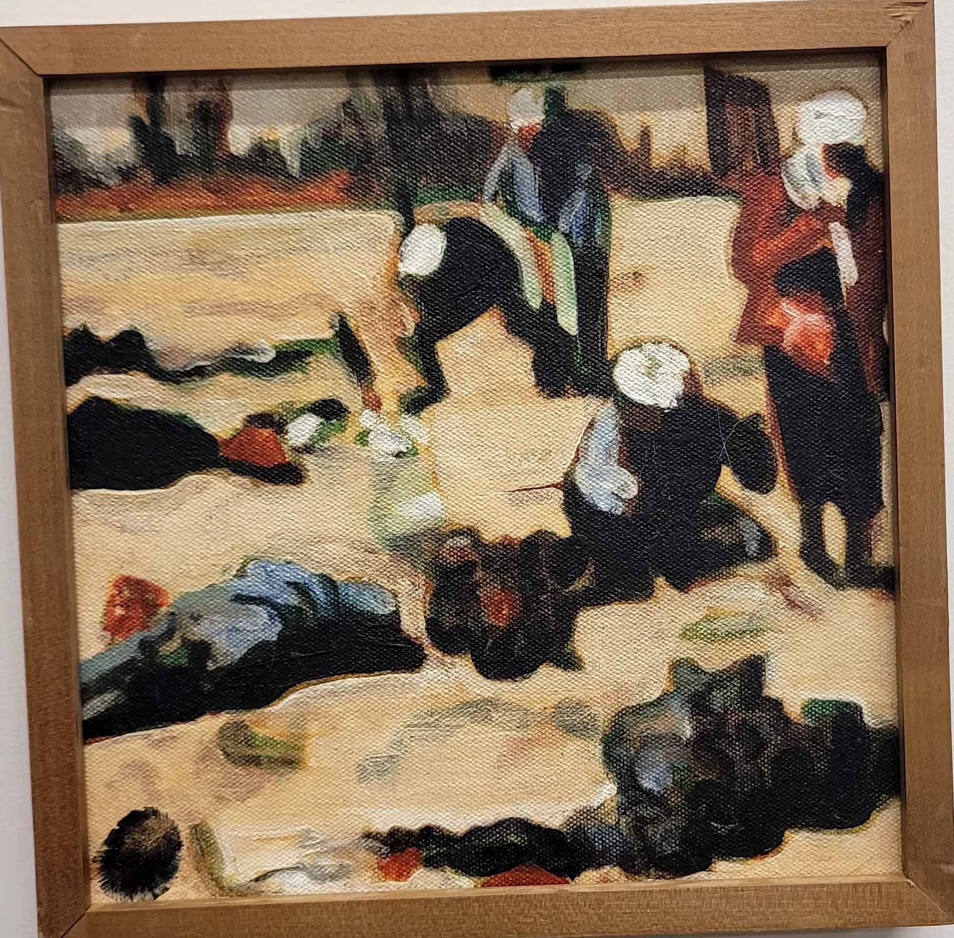 Several figures with white head wraps surveying a desert area with many people dead on the ground. in the far background there are burnt and destroyed buildings. The black fingerprint is in the bottom left this time. Interestingly this is the only piece that has the fingerprint on the left and not the right side. 9/11, desert, death, red, white, sand, humanType of Painting