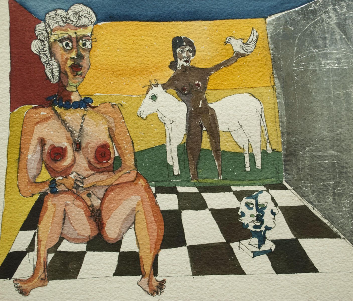 Some pencil marks, smudges in borders. Poorly matted with masking tape. Image in good condition. Two nude female figures.Artwork Details