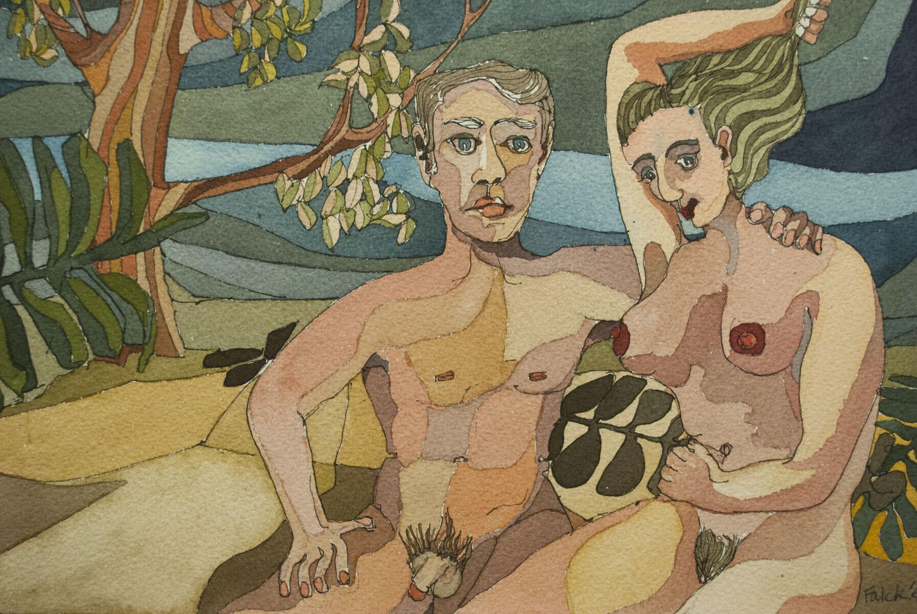 Tape adhesive remaining on back. Few points of light foxing in borders. Nude man and woman.Artwork Details