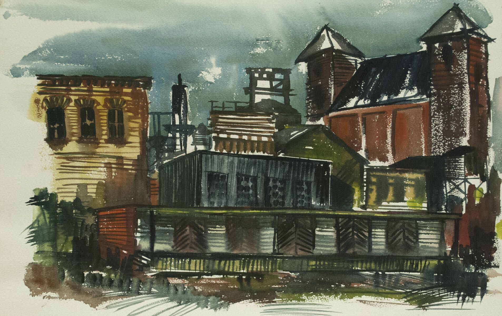Foxing, smudges in borders. Tape adhesive remaining in borders. Cityscape.Location