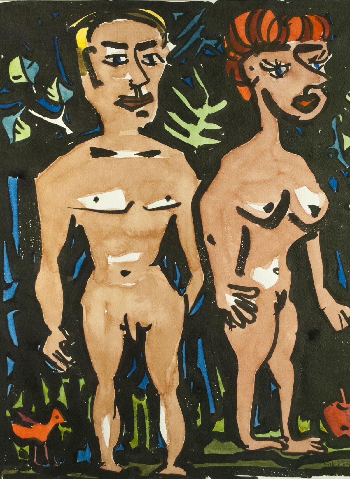Poorly matted with masking tape. Image in good condition. Two figures-Adam and Eve?Location