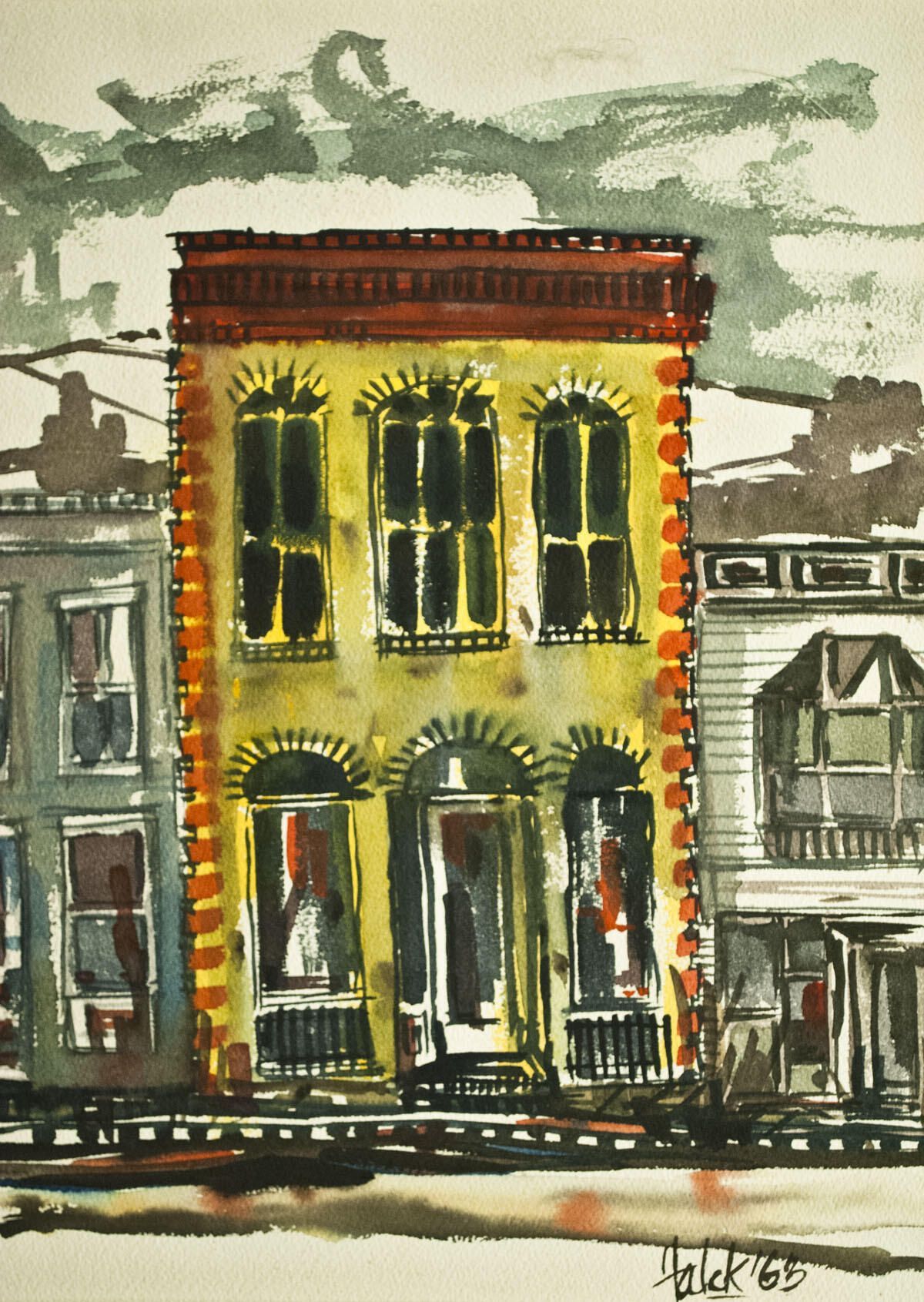 Foxing throughout image, poorly matted with masking tape. Cityscape.Dimensions