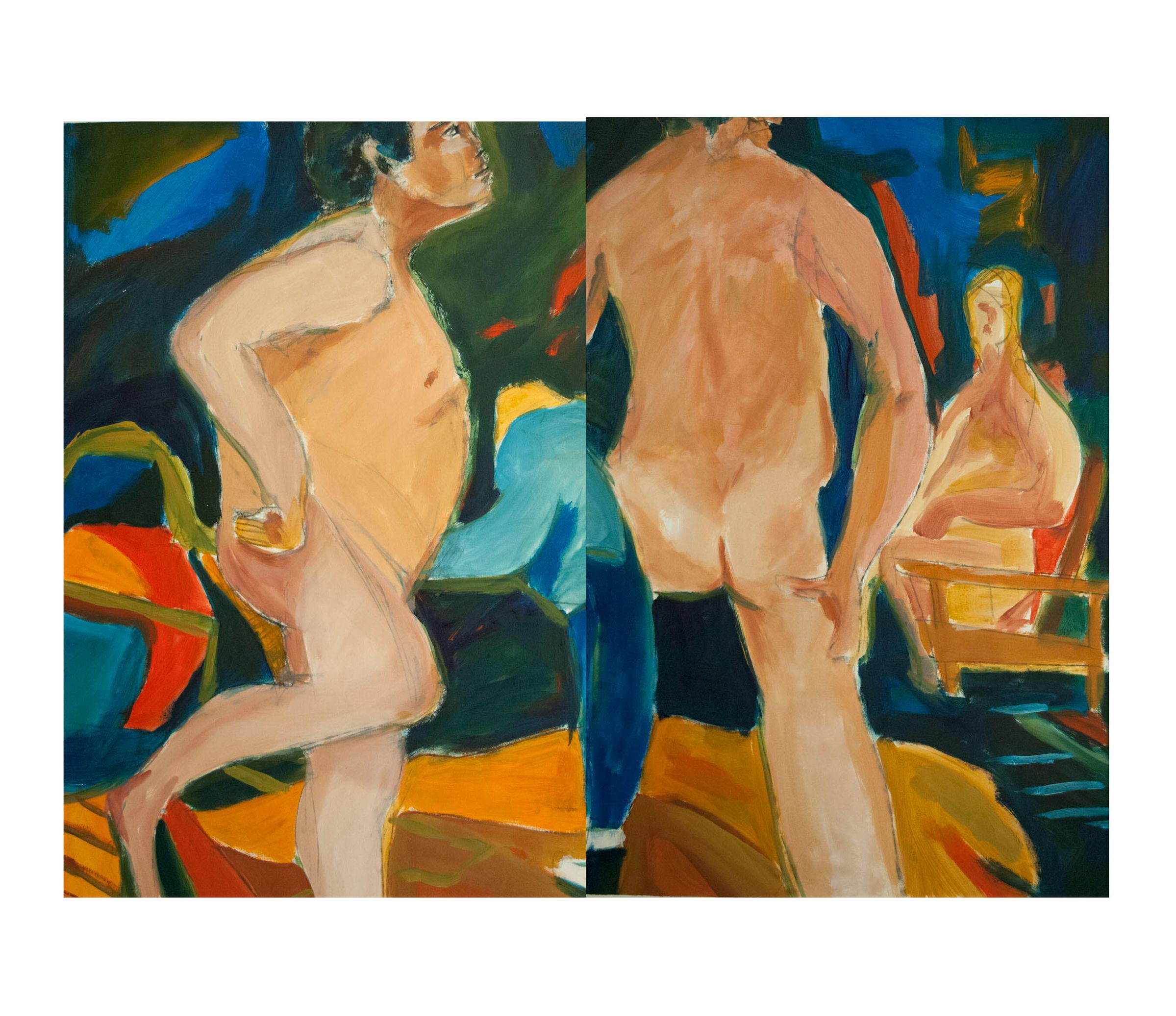 Diptych. Life painting, 4 models, one clothed. Image in good condition. Pinholes in corners, masking tape adhered to bottom border of .aArtwork Details