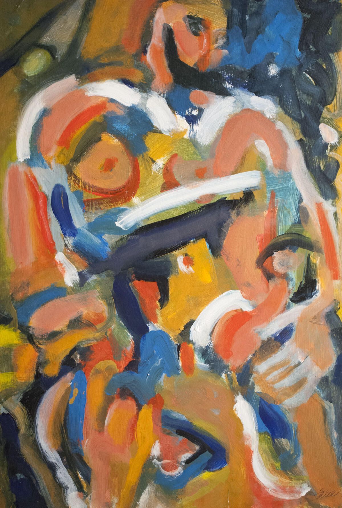 Bleed image, multiple pinholes and tears throughout edges. Tears repaired by artist with scrap paper and acrylic medium. Seated figure.Location
