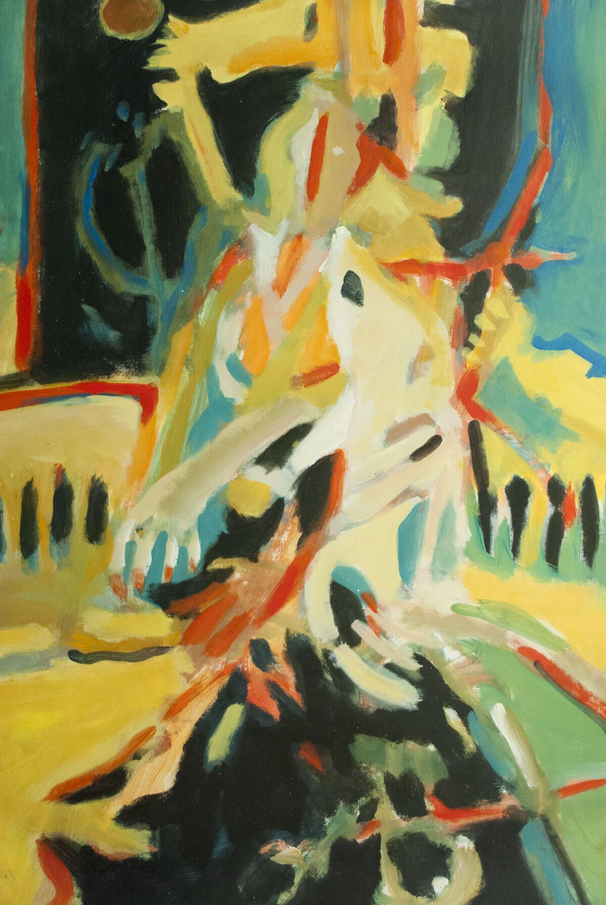 Multiple pinholes in corners, bleed image. Multiple points of white paint transferred. Abstract figure. Montserrat series.Location