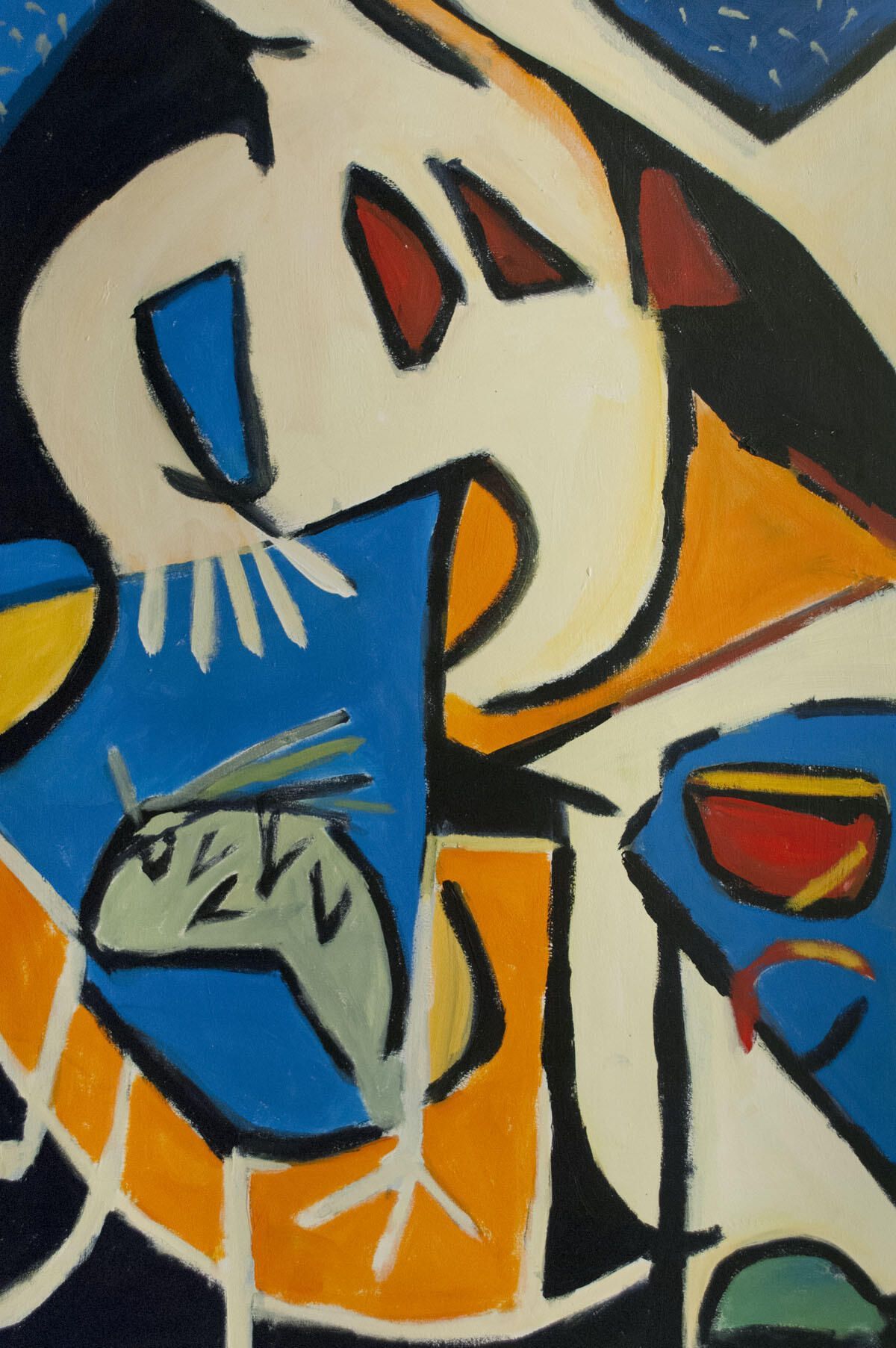 Abrasions, smudges throughout the border. Abrasions, paint transfer in image. Seated figure, fish. Munroe street series.Location
