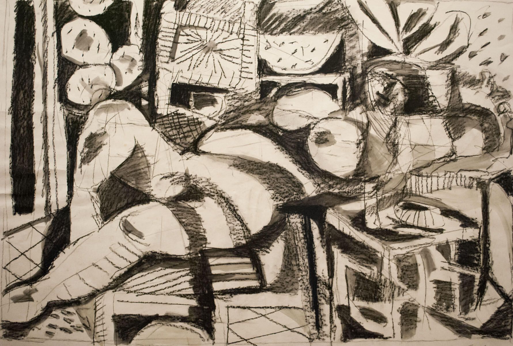 Creased left border, going into image in lower-left and upper-right corners. Smudges, abrasions in borders, smudges going into image. Female figure reclining. San Miguel series.Artwork Details