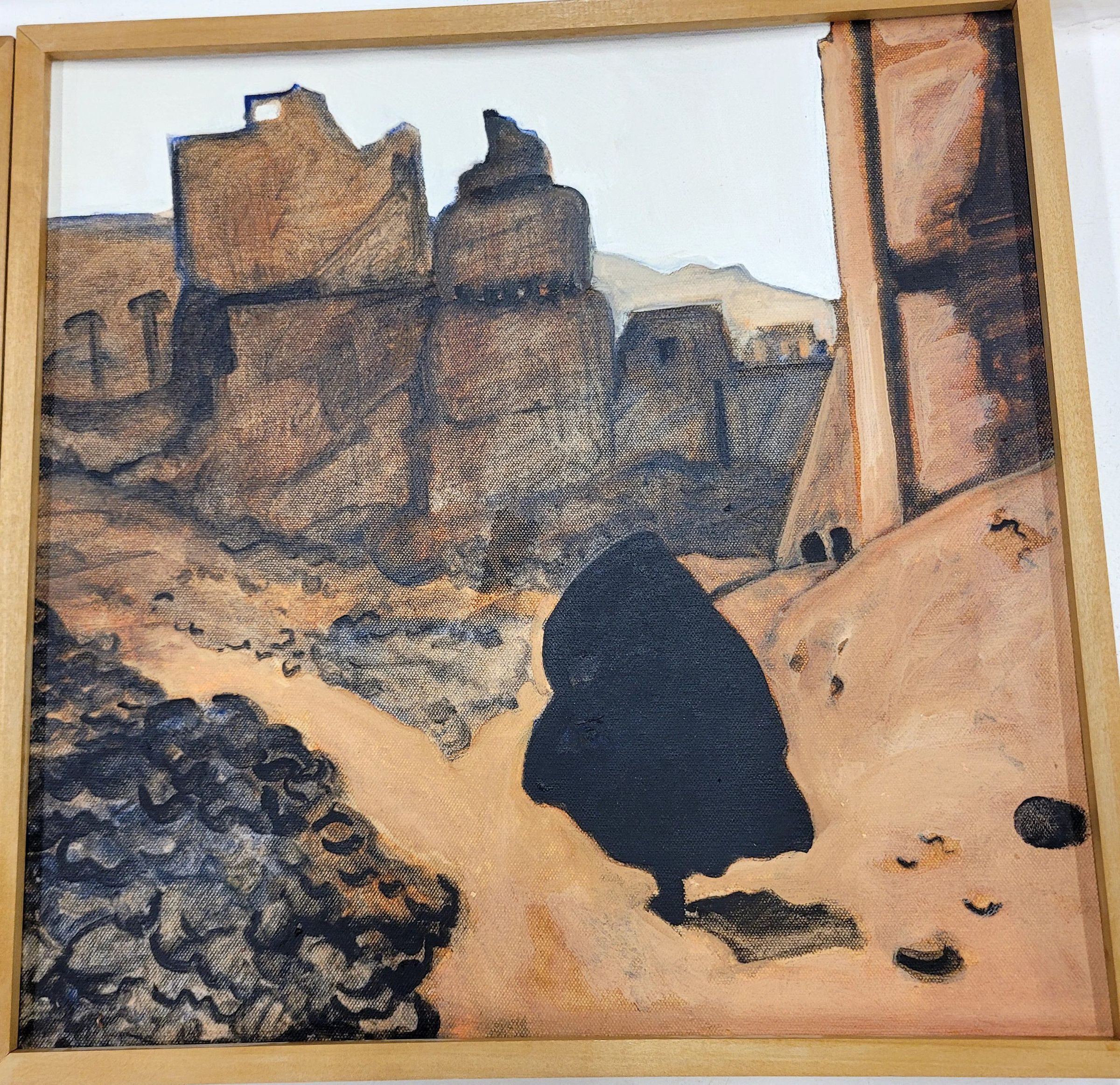 A vaguely triangularly shaped black figure walks into a partly demolished city. Bottom left is filled with rubble. Bottom right has Pete's iconic black fingerprint.9/11, destruction, city, human, figureType of Painting
