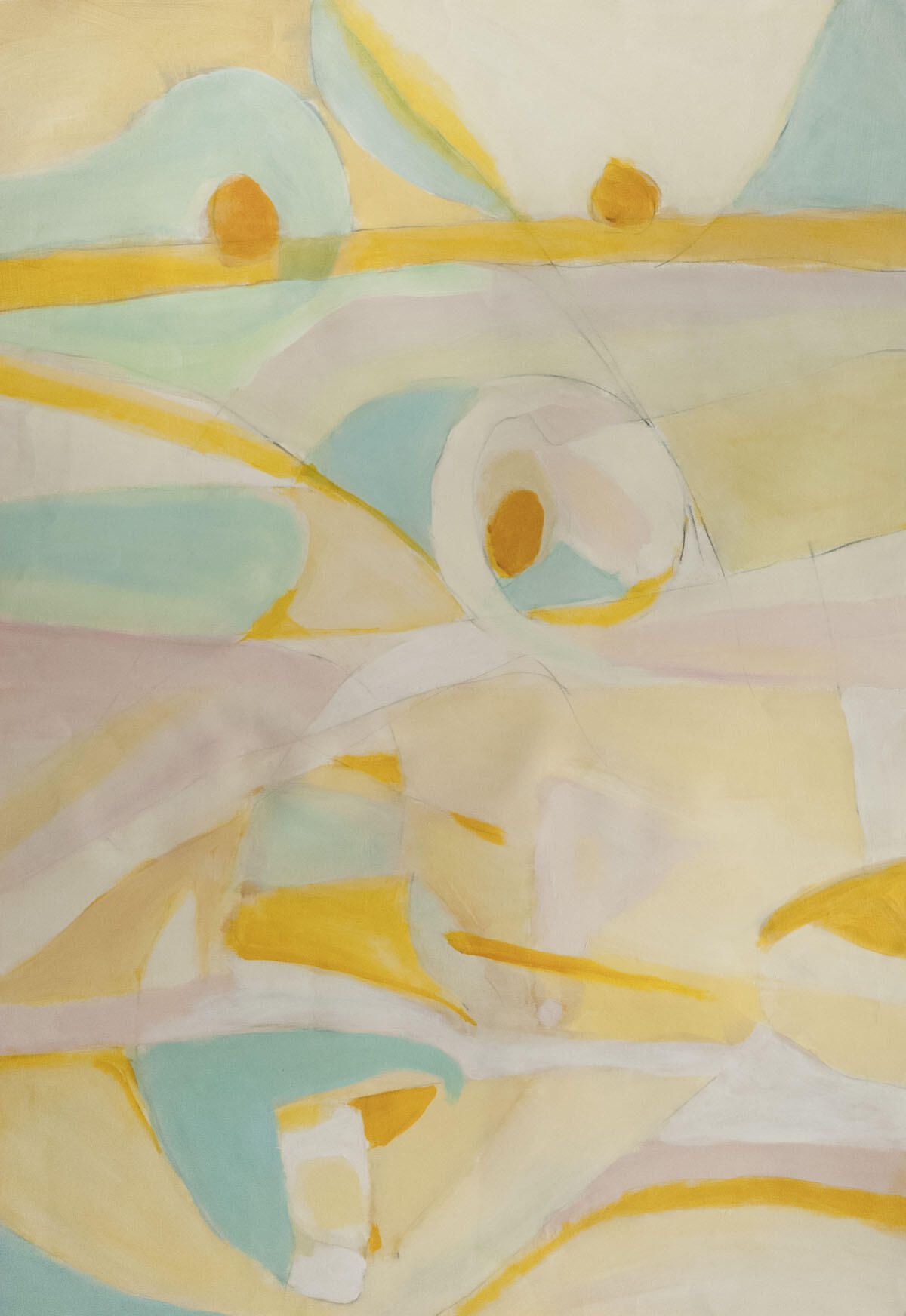 Two sheets adhered to form larger image area. Tear in upper border, gouge in bottom-right corner, crease in upper-left border. Tears and creases throughout left border. Soft-colored abstract portrait.Location