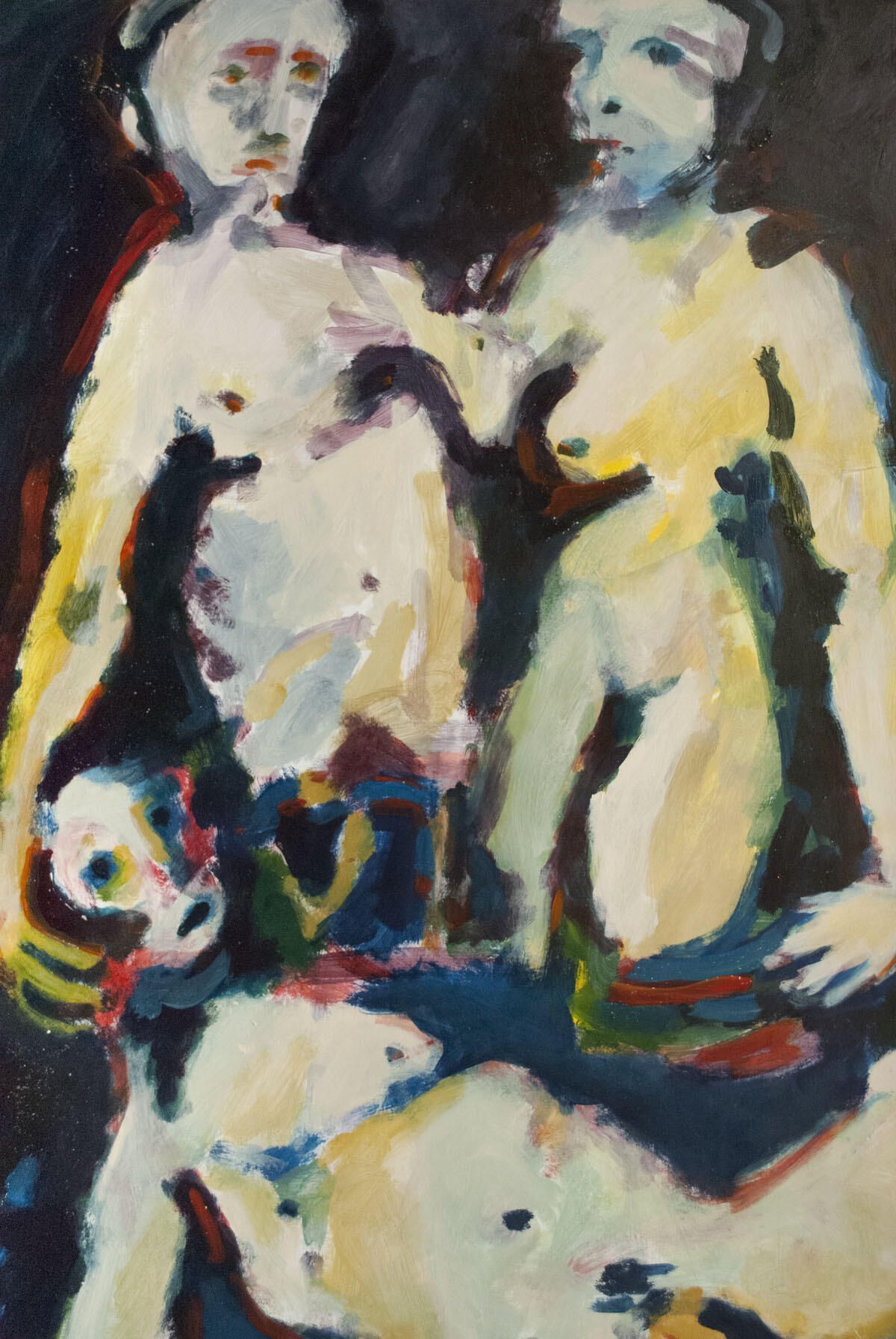 Bleed image, multiple pinholes in corners. Paper adhered, paint transfer, some abrading of image surface. Three nude figures. Montserrat.Location