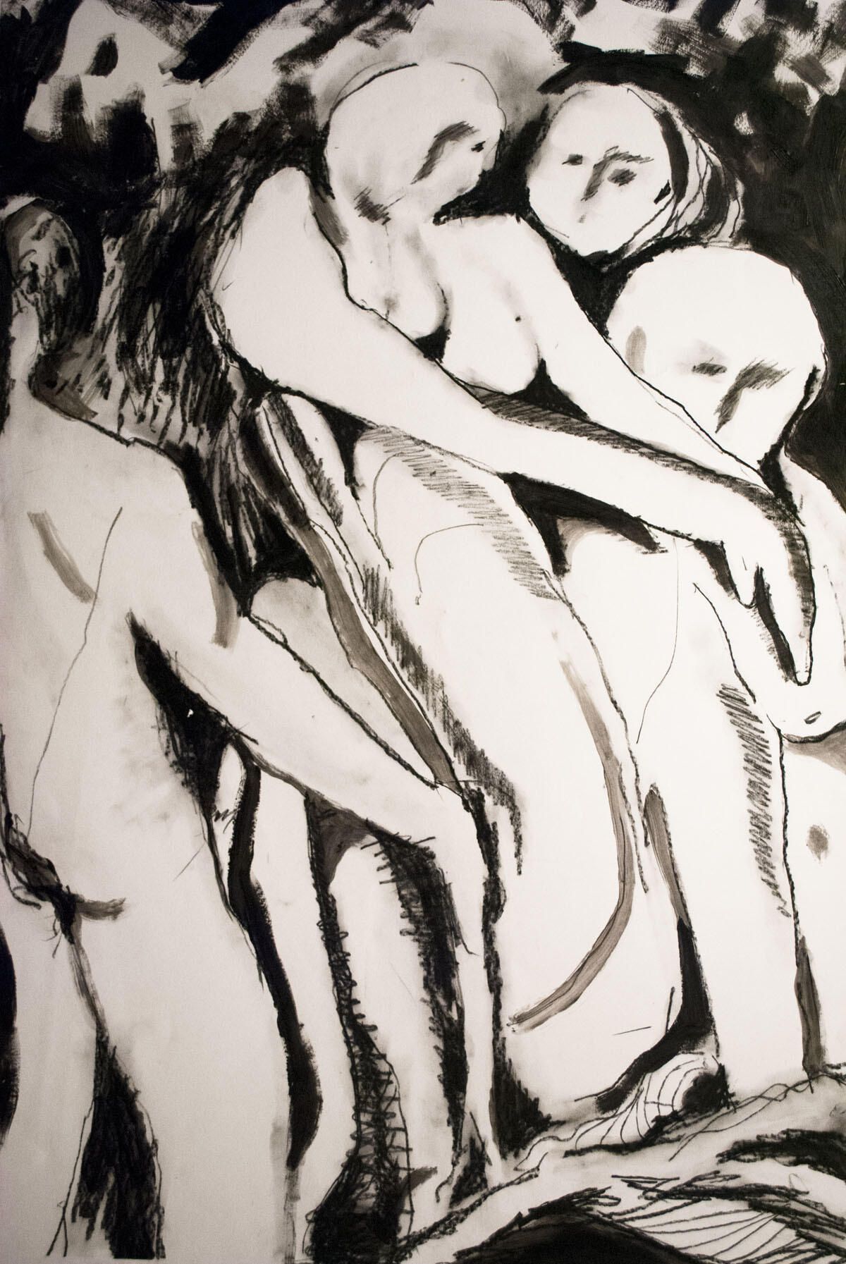 Smudges, abrasions in borders. Image in good condition. Three female figures.Artwork Details