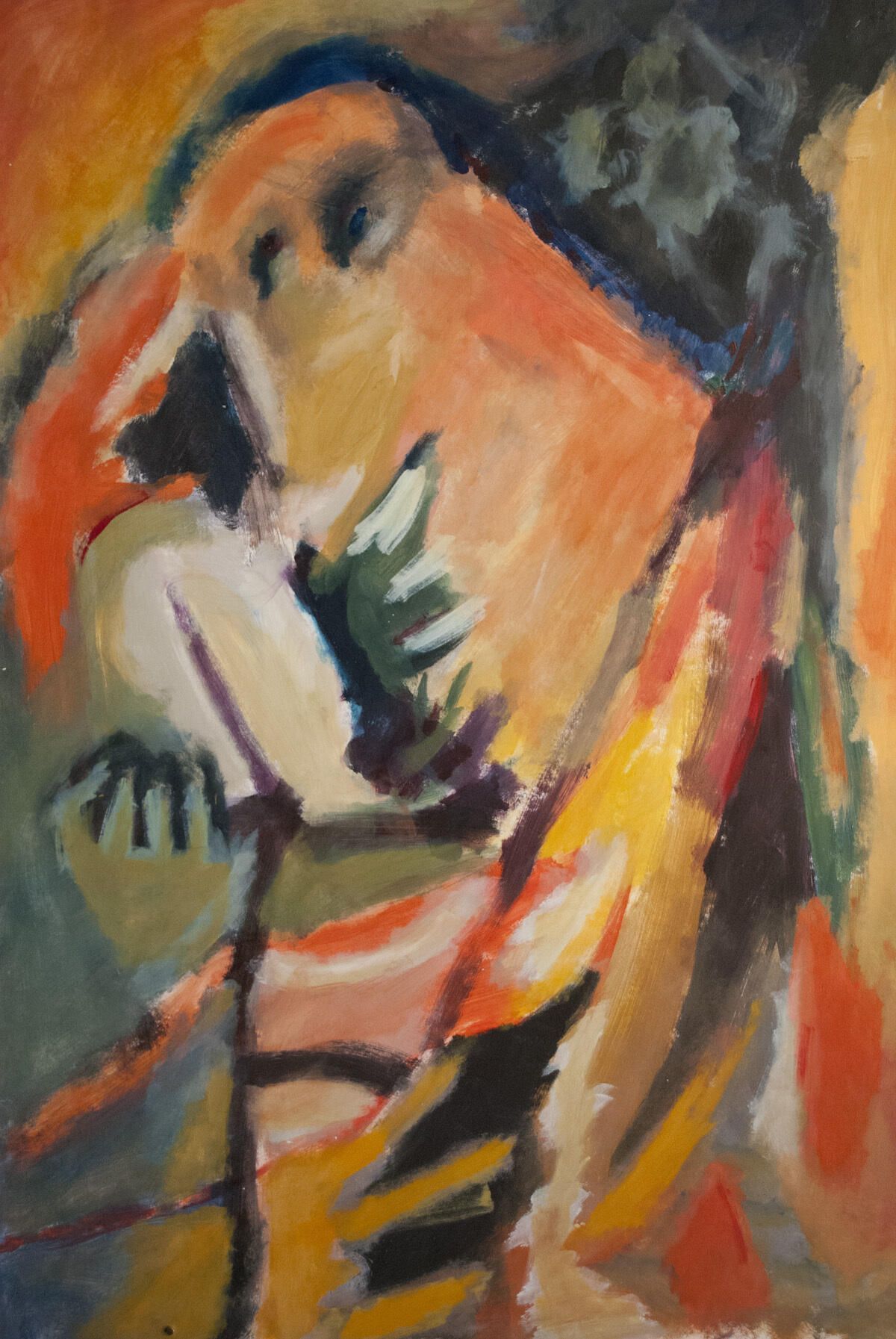Reinforced at top with canvas due to large number of multiple pinholes in corners. Bleed image. Abstract figure. Montserrat series.Location