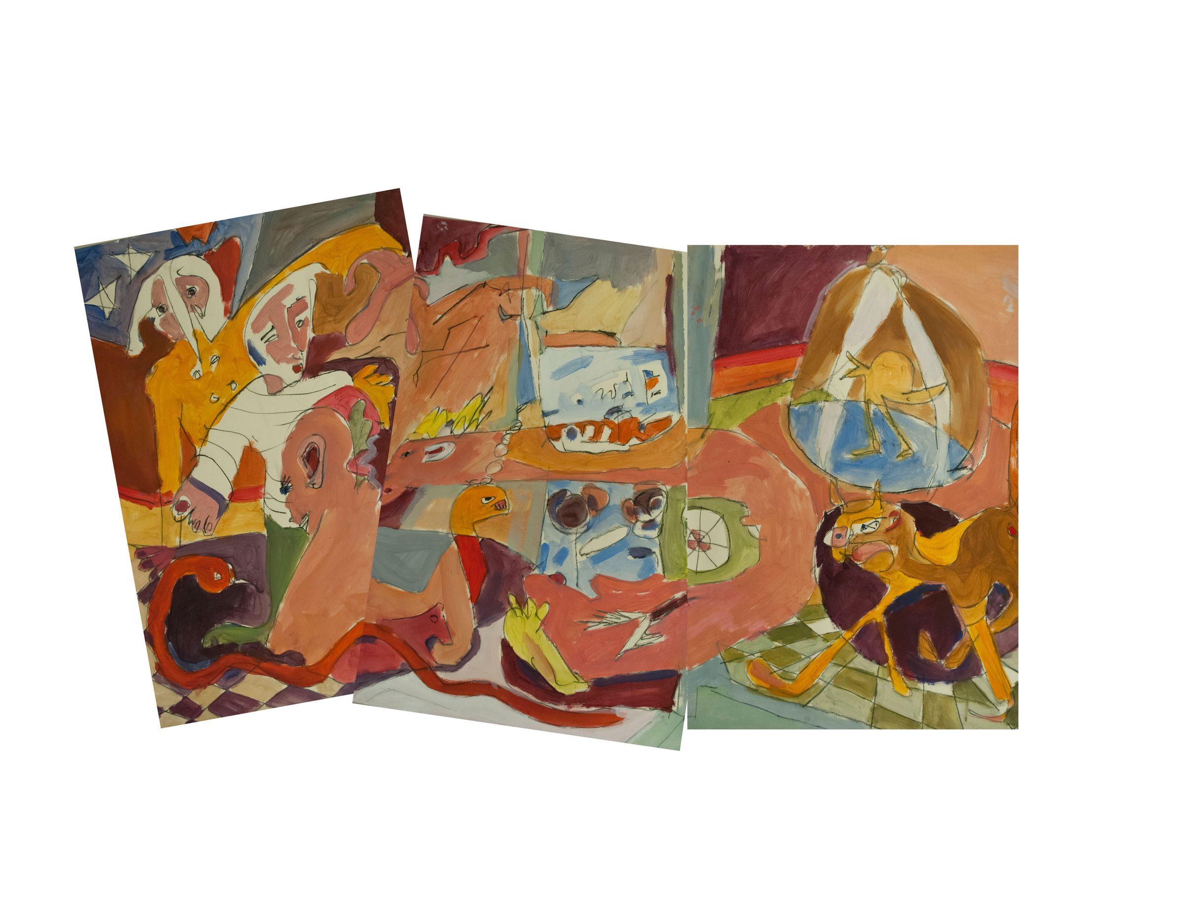 Image covers 3 sheets, staggered in a row. Pinholes in corners of each. Abrasions in .c, smudges and pigment transfer throughout each. Tear in non-image area of .a Dream, circus scene?Artwork Details