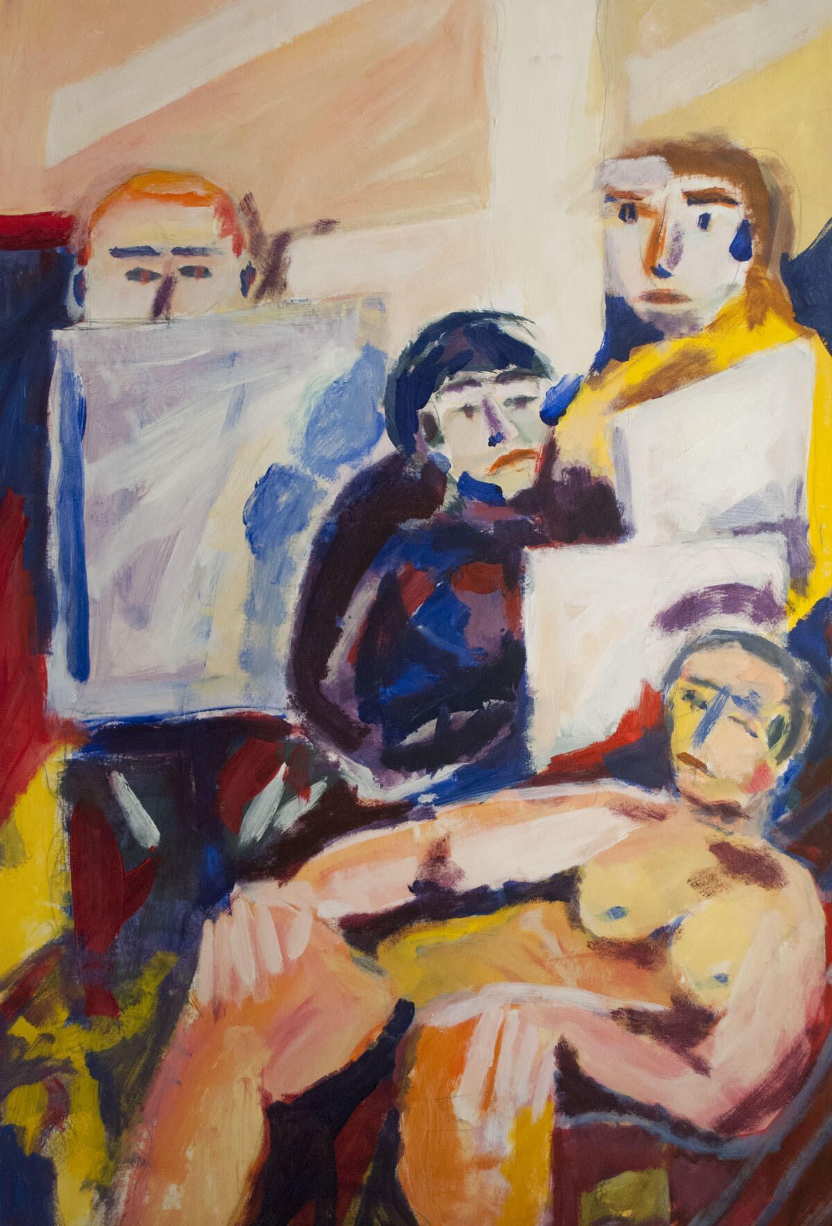Pinholes in top corners of image. Tear bottom border. Minor smudging in borders. Figure - nude model with painting students.Artwork Details