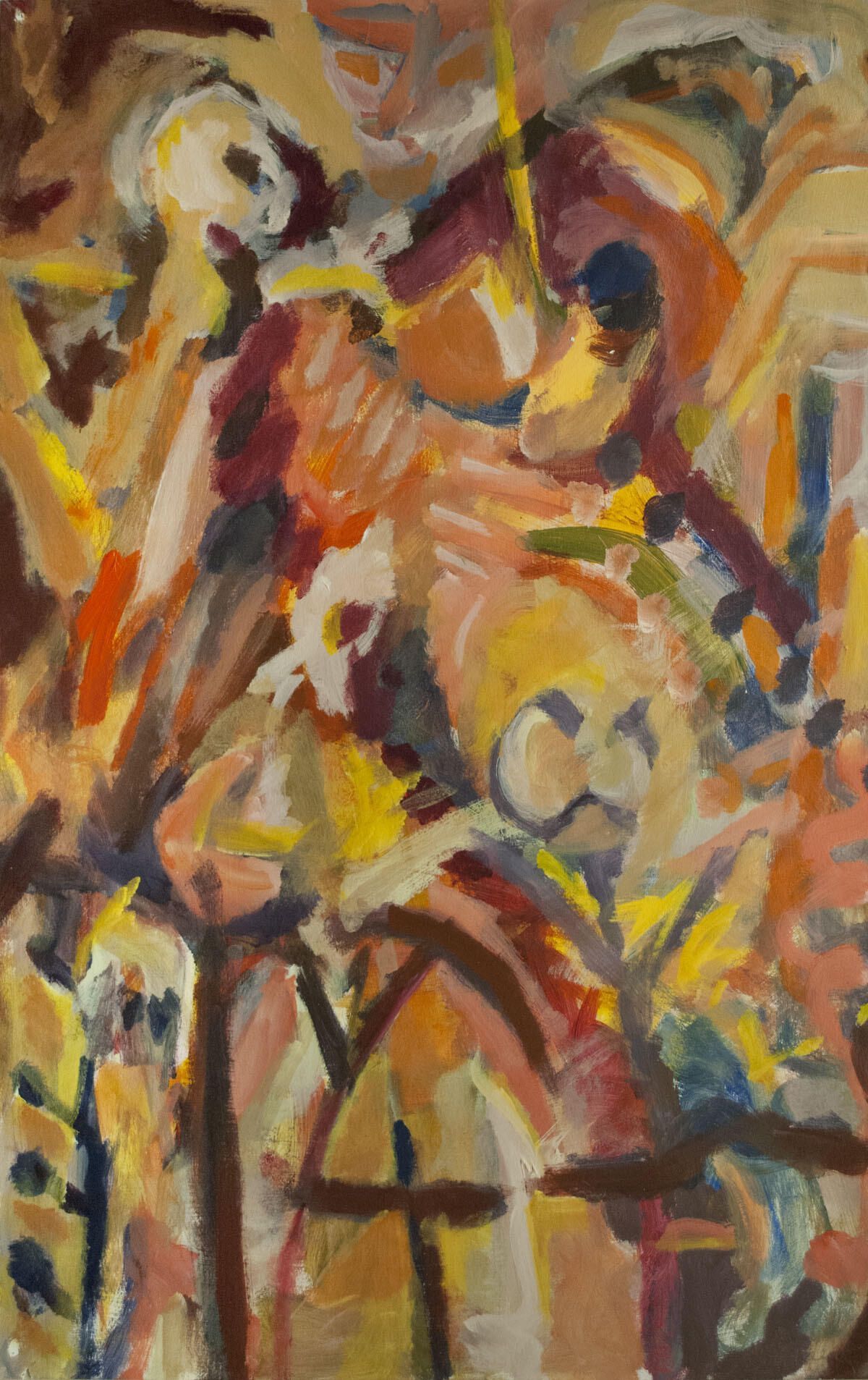 Bleed image. Tears and pinholes in corners. White paint transferred from another image in upper-right quadrant. Abstracted figure reclining.Location