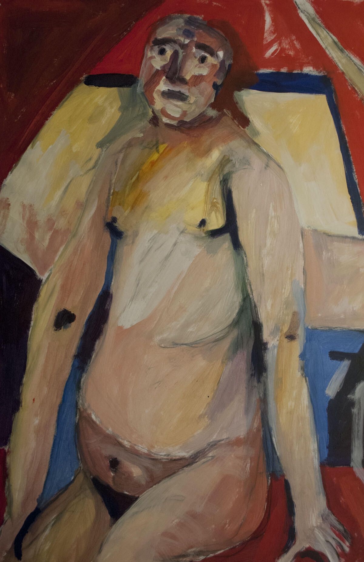 Bleed image, multiple pinholes in corners. Small points of pigment (black and red) throughout image. Large tear in left edge, well into image, repaired by artist with scrap paper and acrylic medium. Male nude figure.Artwork Details