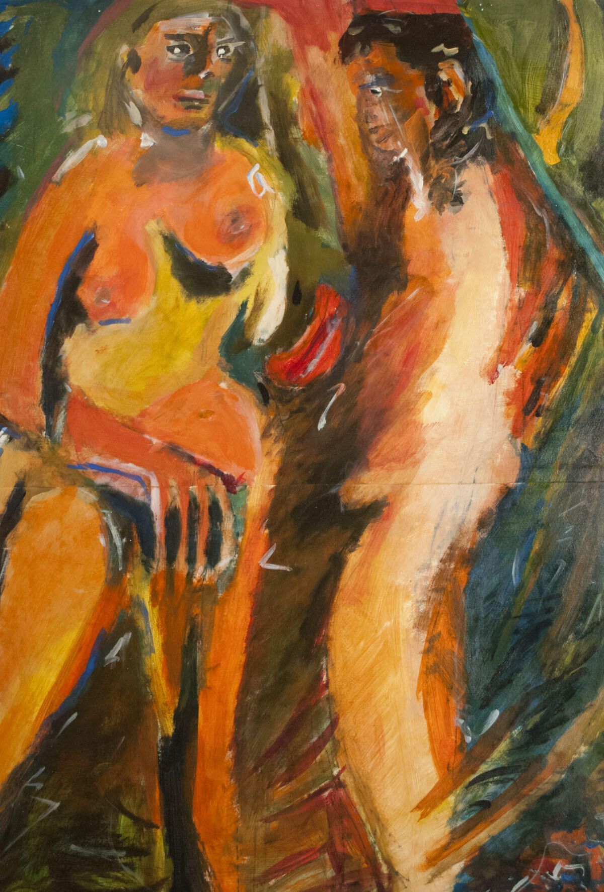 Two sheets adhered together to form larger image area. Large tear in right edge, attempted repair by artist with scrap paper glued on with acrylic medium. Paper creased/compressed in upper-left corner. Image in good condition. Two standing figures. Home series.Dimensions
