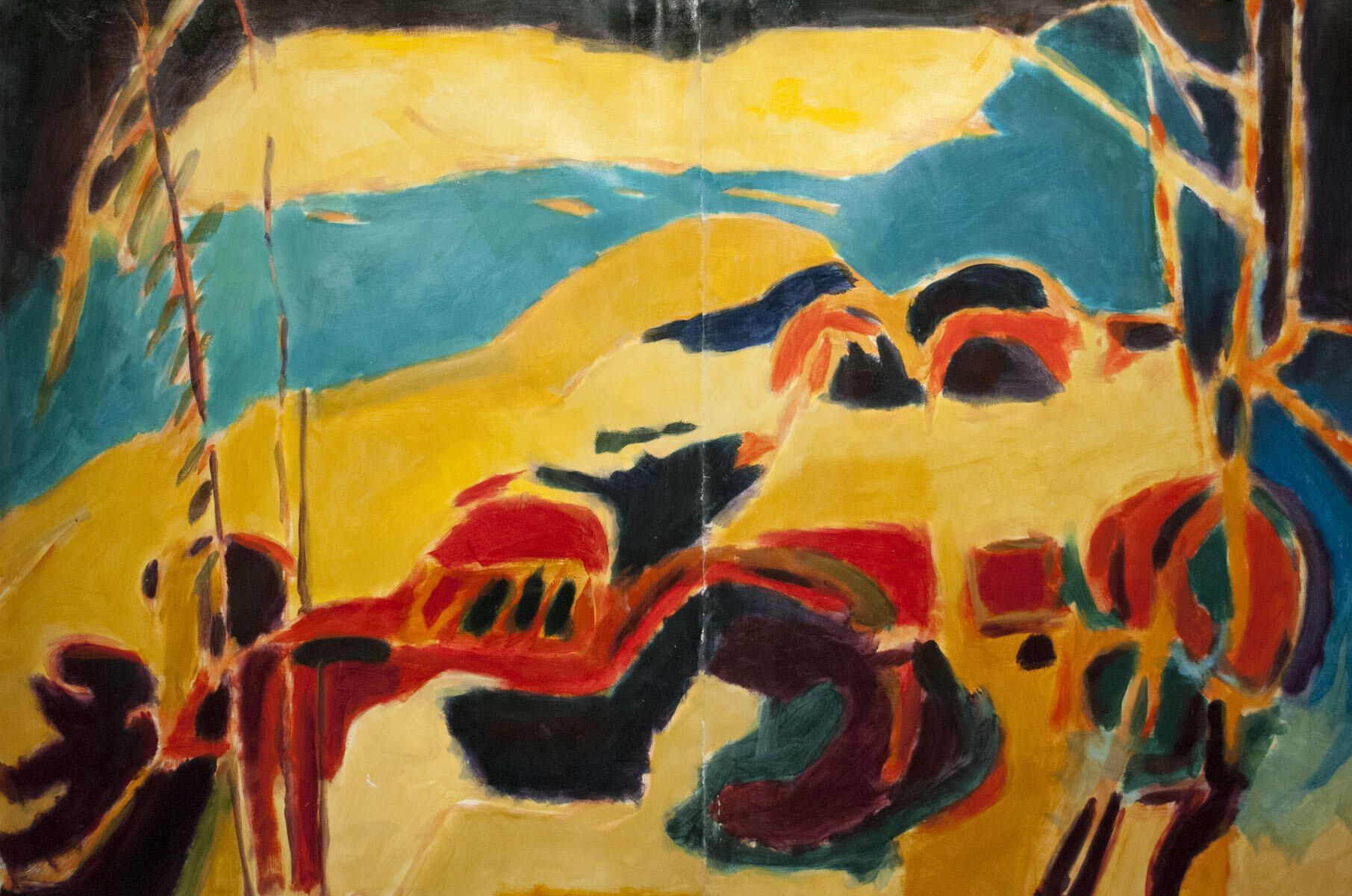 Two sheets adhered to form larger image area. Slight abrasions throughout borders, pinholes in corners. A few small points throughout where pigment has transferred from another painting. Abstract landscape.Dimensions
