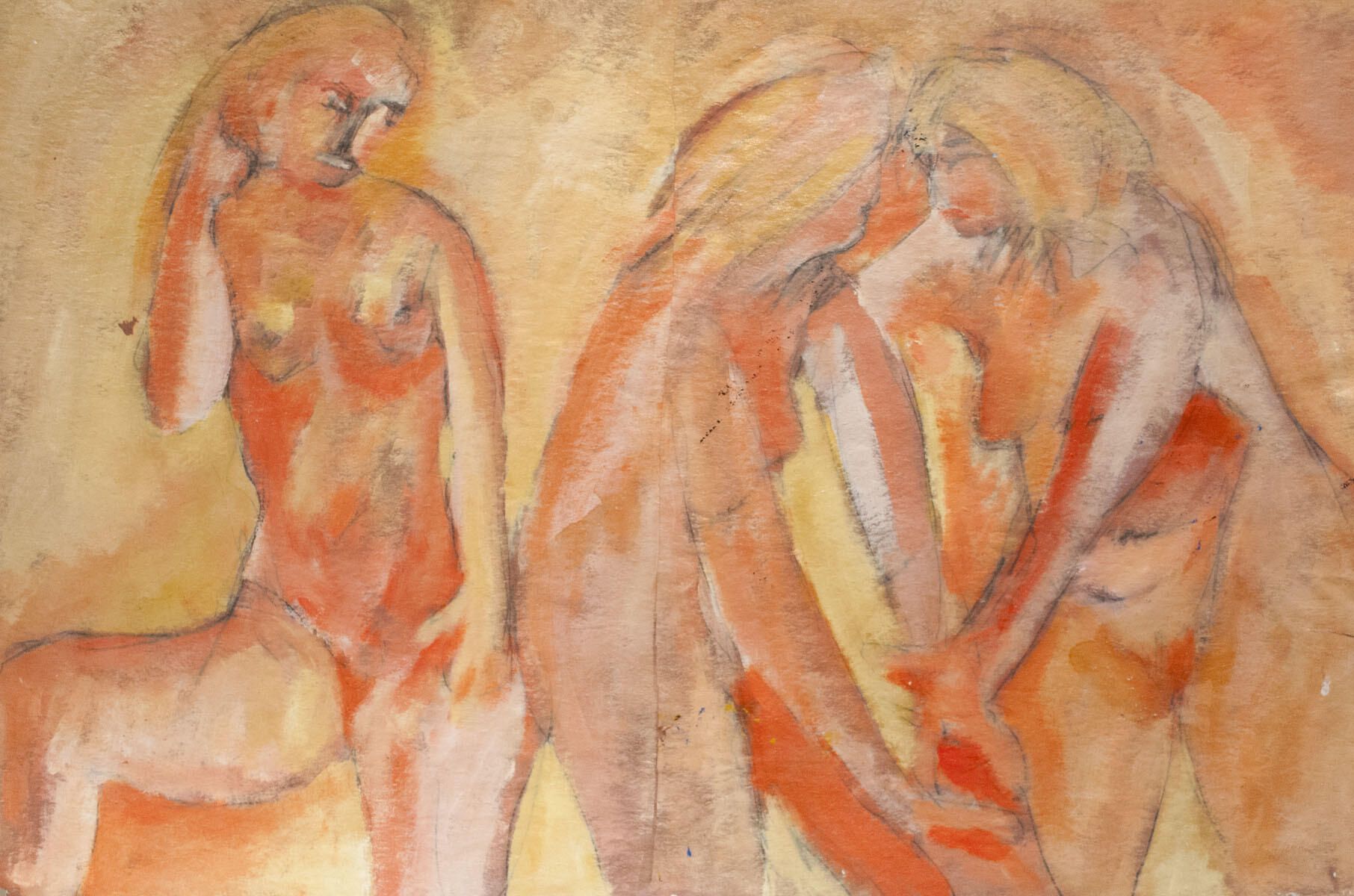 Two sheets adhered together to form a larger image area. Black, blue, white pigment transferred throughout from another painting. Tears in lowerleft and lower-right corners. Three nude female figures. Mateus series.Artwork Details