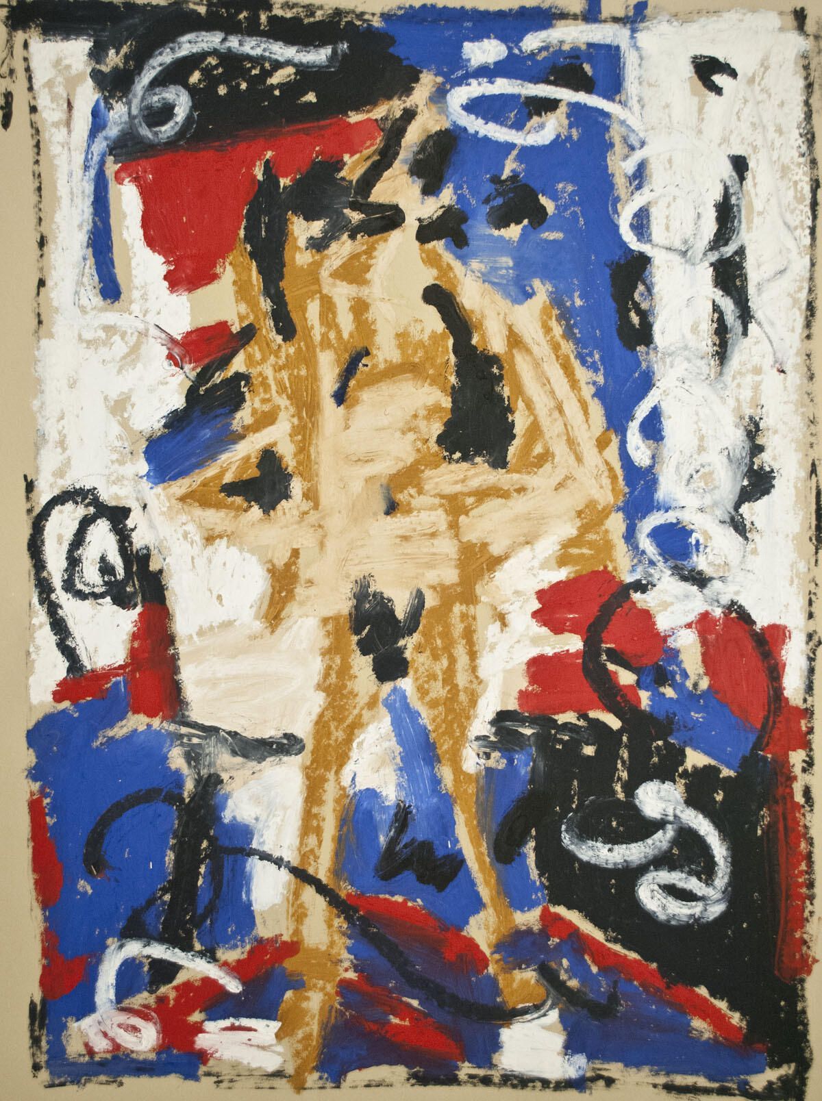 Abstract figure. Pinholes in corners, image in good condition. Series? Red, blue, black, gold, white. patriot, human, strength, abstractLocation
