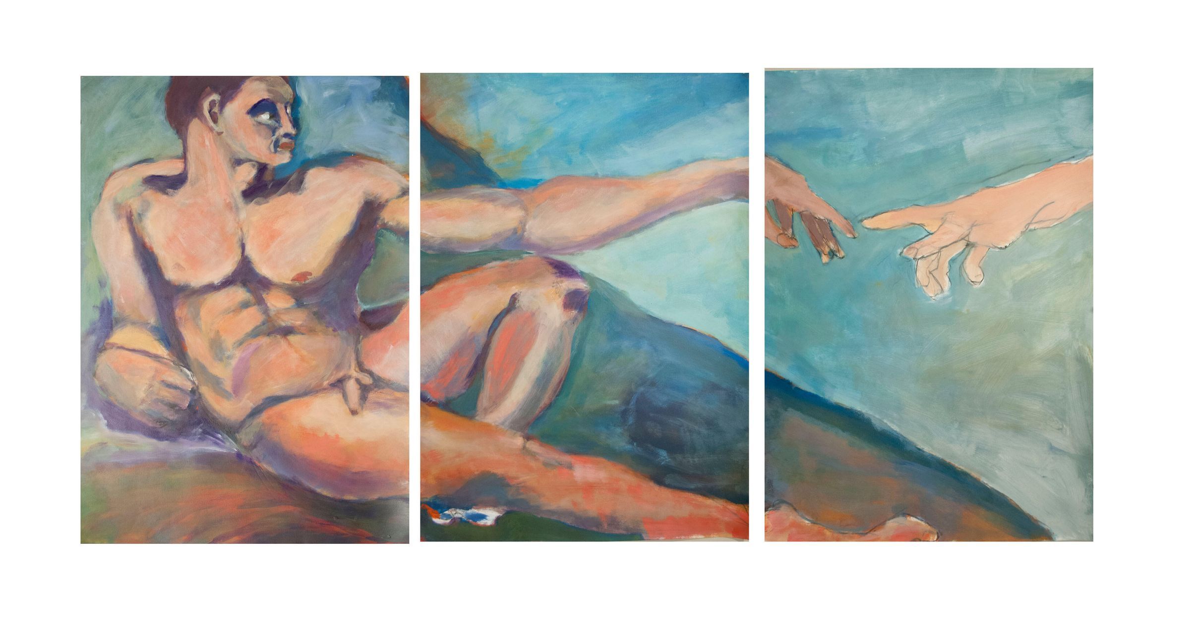 After Michalangelo’s Creation of Man. Seems to be unfinished. Triptych. Overall dimensions: 22 in x 60 in. In overall good condition.Location