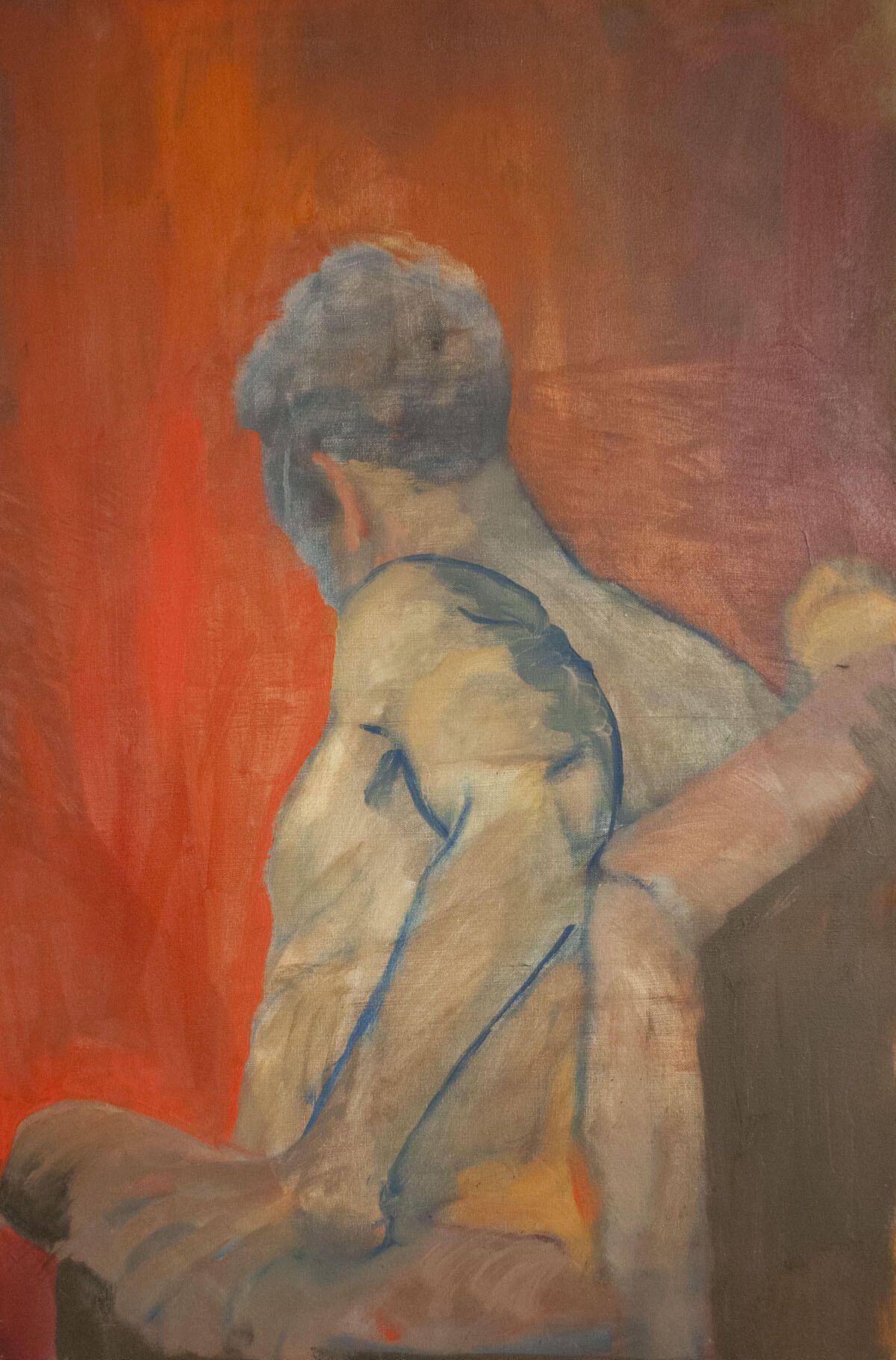 Seated nude male figure, seen from back. Light layer of dust, but otherwise in good condition. red, brown, man, human, womanAcquisition