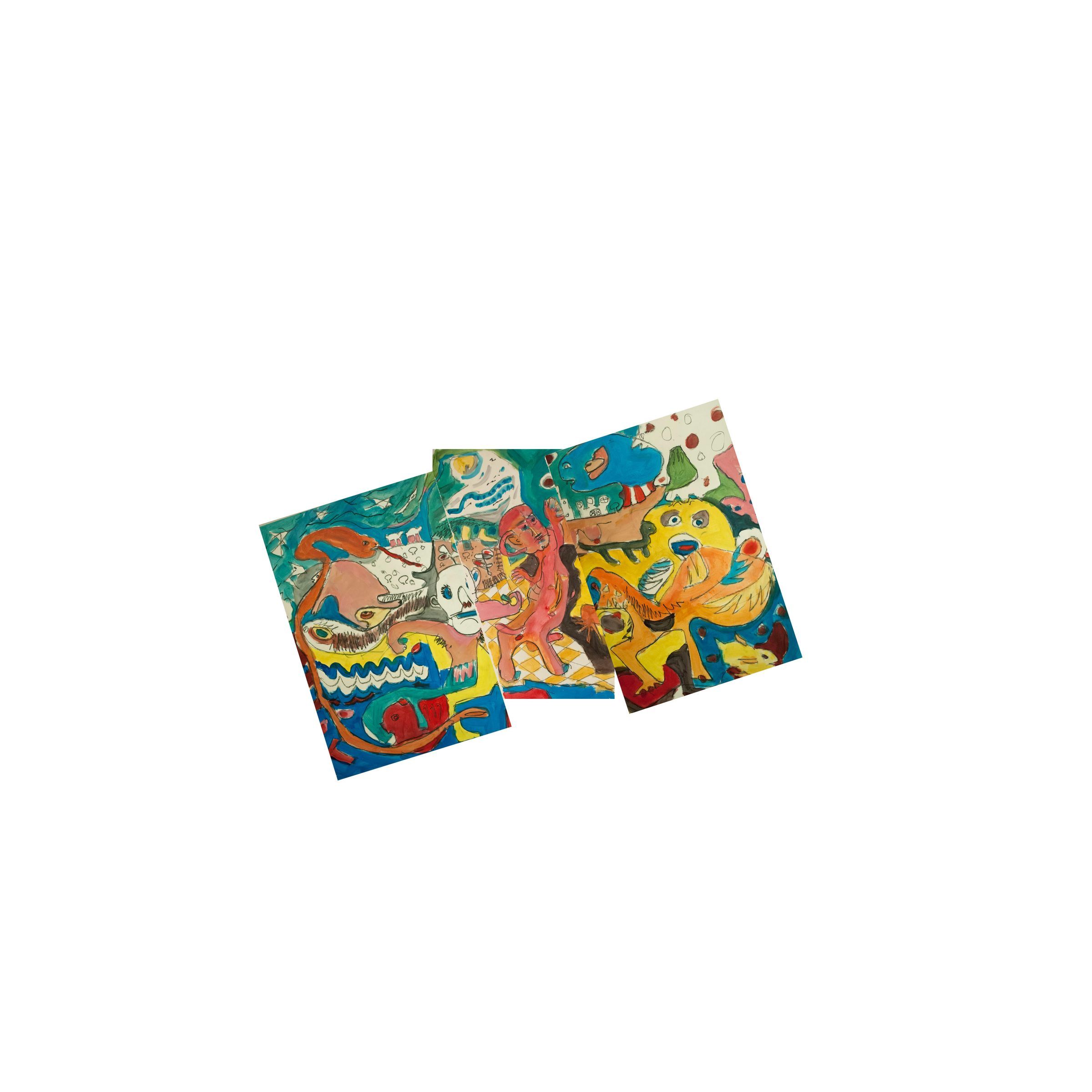 Triptych—staggered sheets. Pinholes in corners of each. Tears in .c corners reinforce because of number of pinholes. Abstract surreal seaside? Central nude figure surrounded by animal figures.Artwork Details