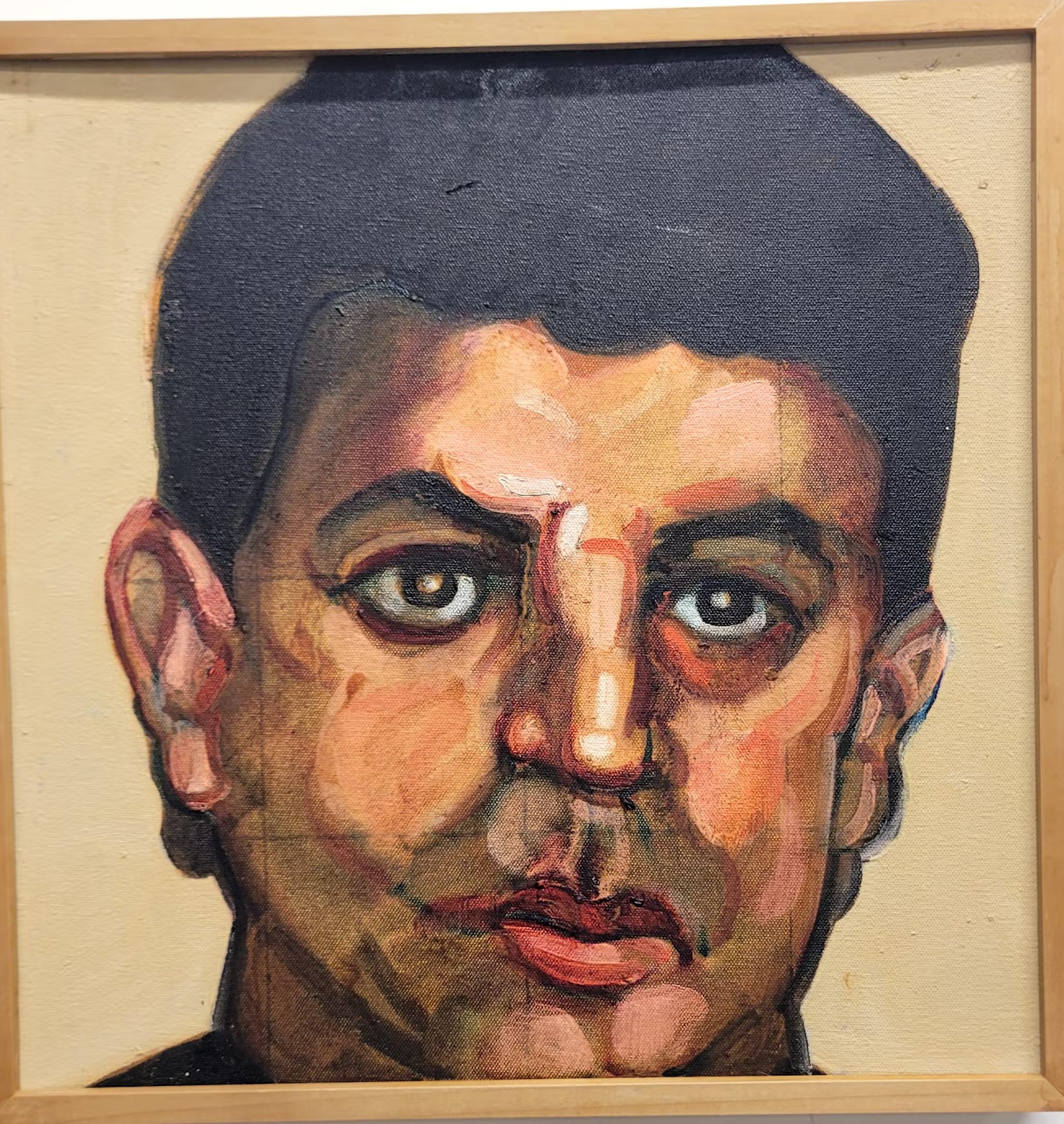 Sandy grey background. Profile of a man. Pencil grid pattern to lay face out is visible. Short black hair, only neck no shoulders. 9/11, human, man, black, brown, yellow, whiteType of Painting