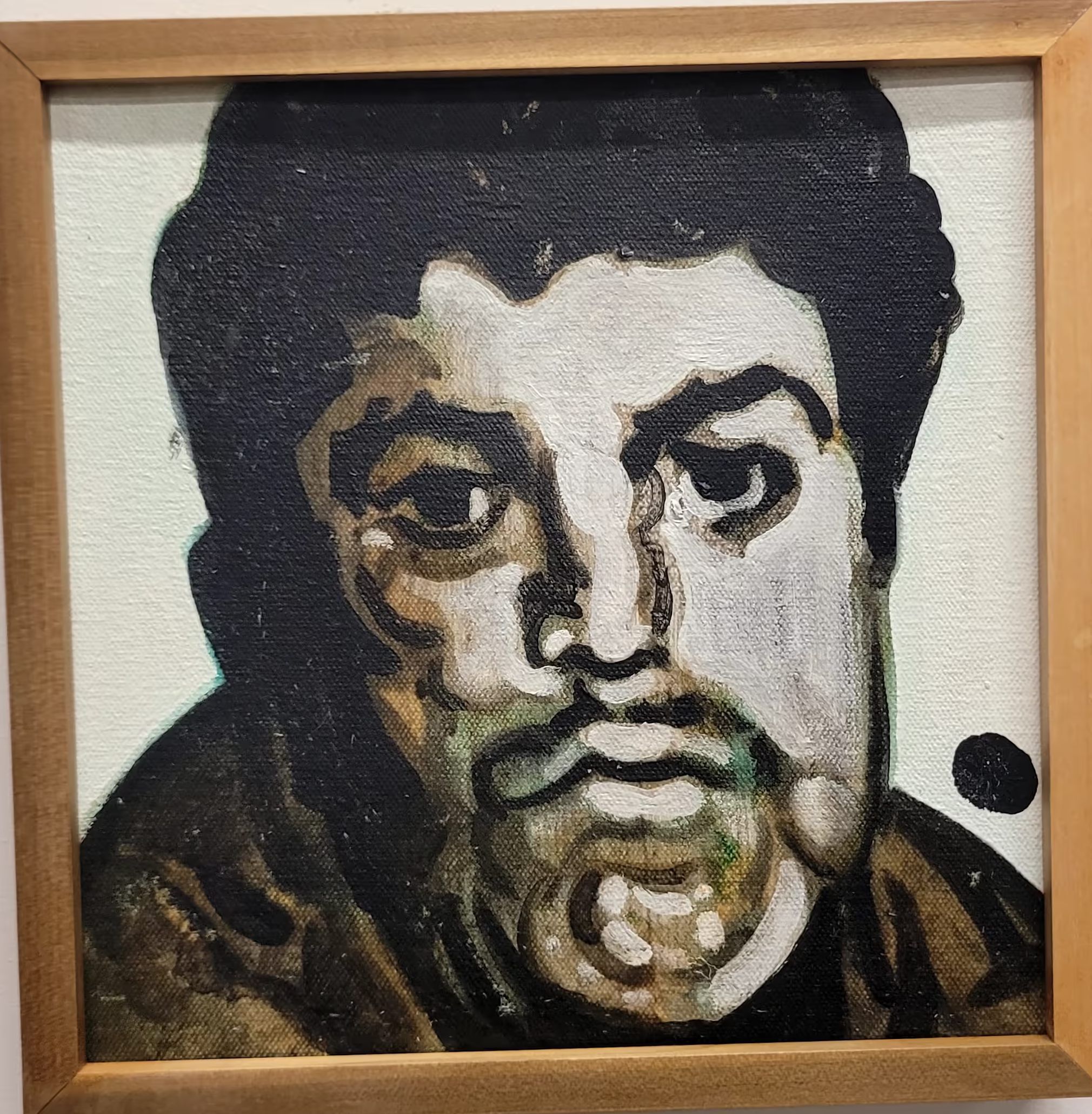 Black, white, grey, green, and yellow. Profile of a larger man, deep chin lots of rolls and curls on his face. Black fingerprint on lower right side of painting. Background matches skin tone grey. grey, black and white, human, 9/11, manType of Painting