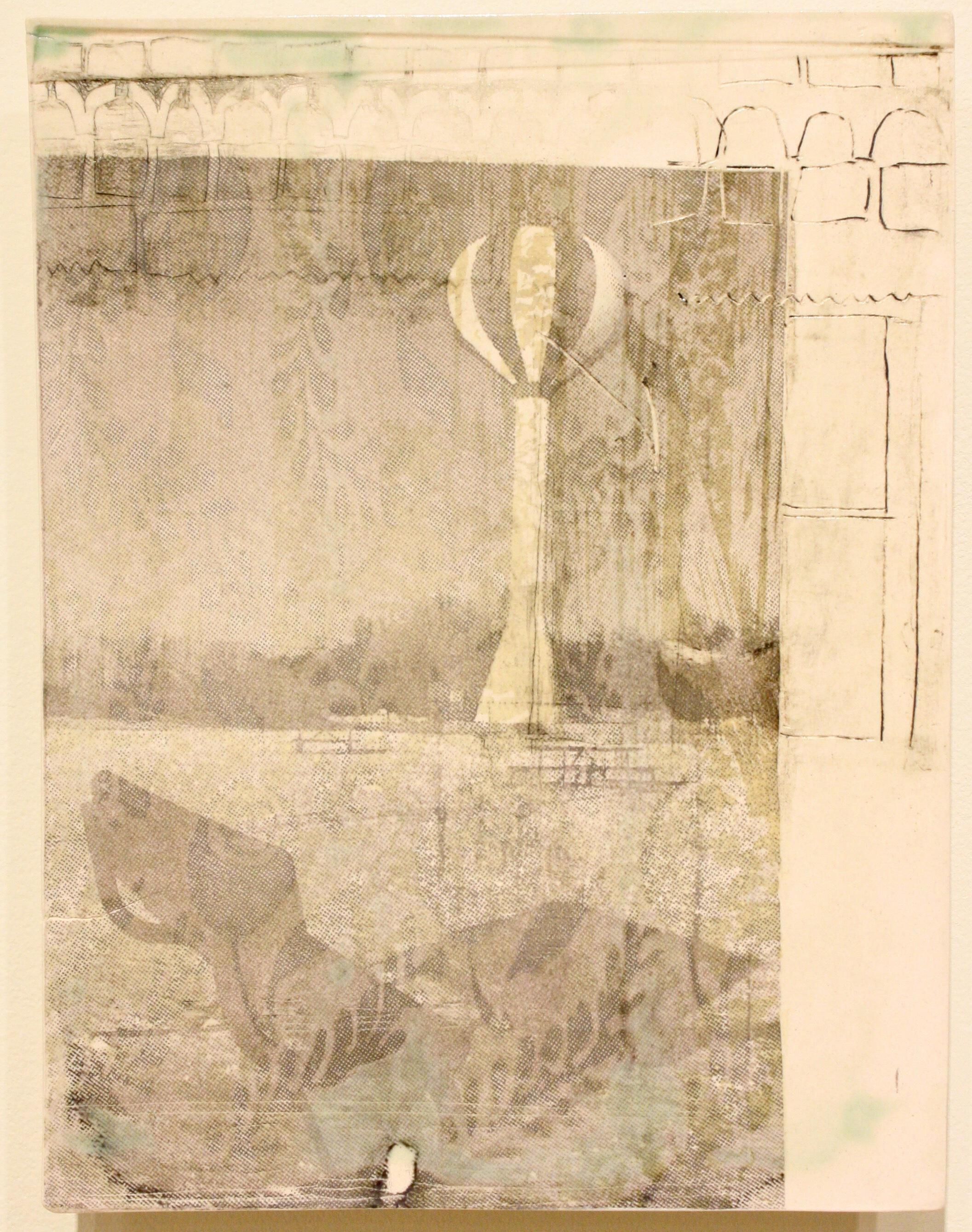 silkscreen, intaglio, glaze, cone 8 oxidation on porelain