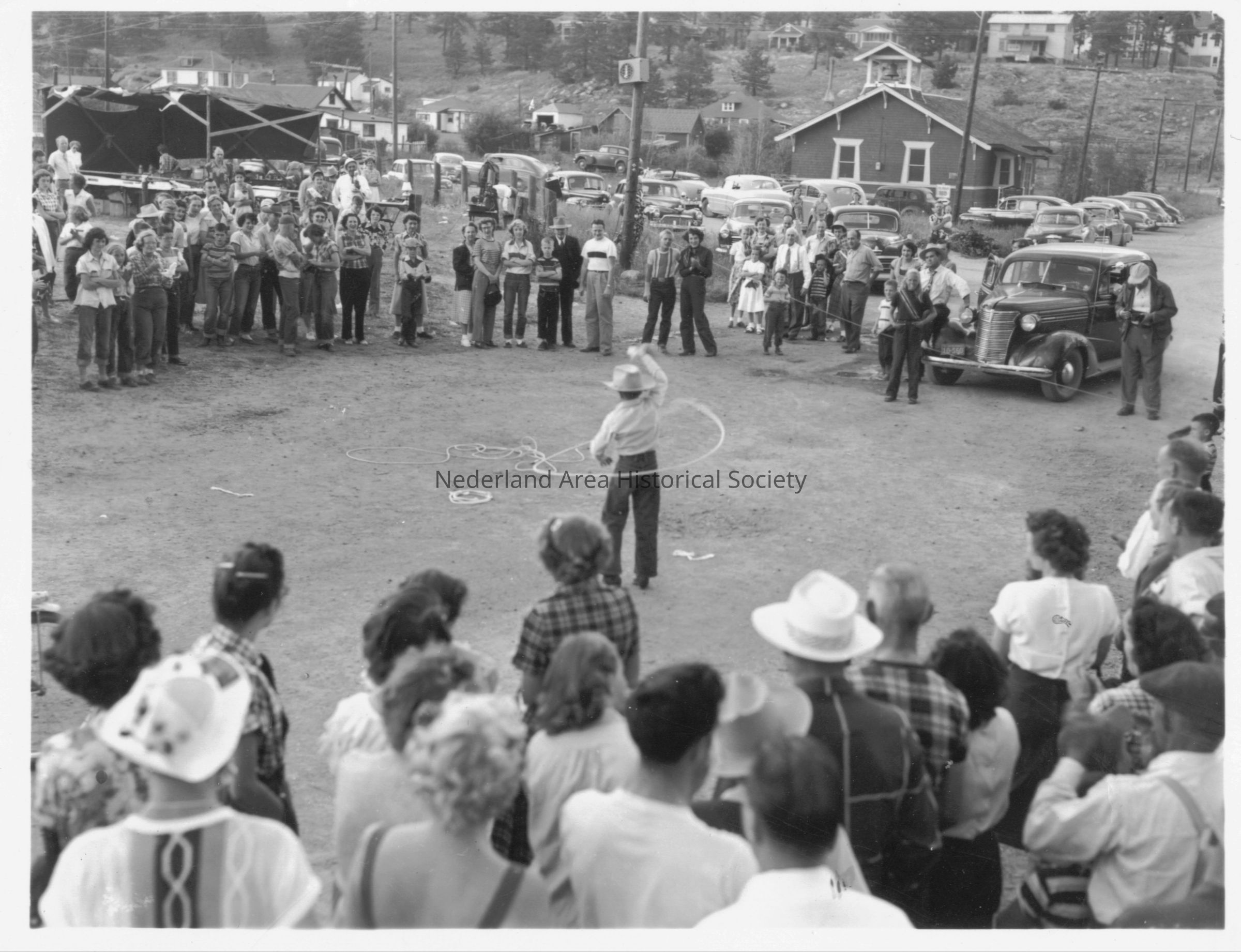 Cowboy performing lasso tricks to crowd during Nederland's first JamboreeCollection