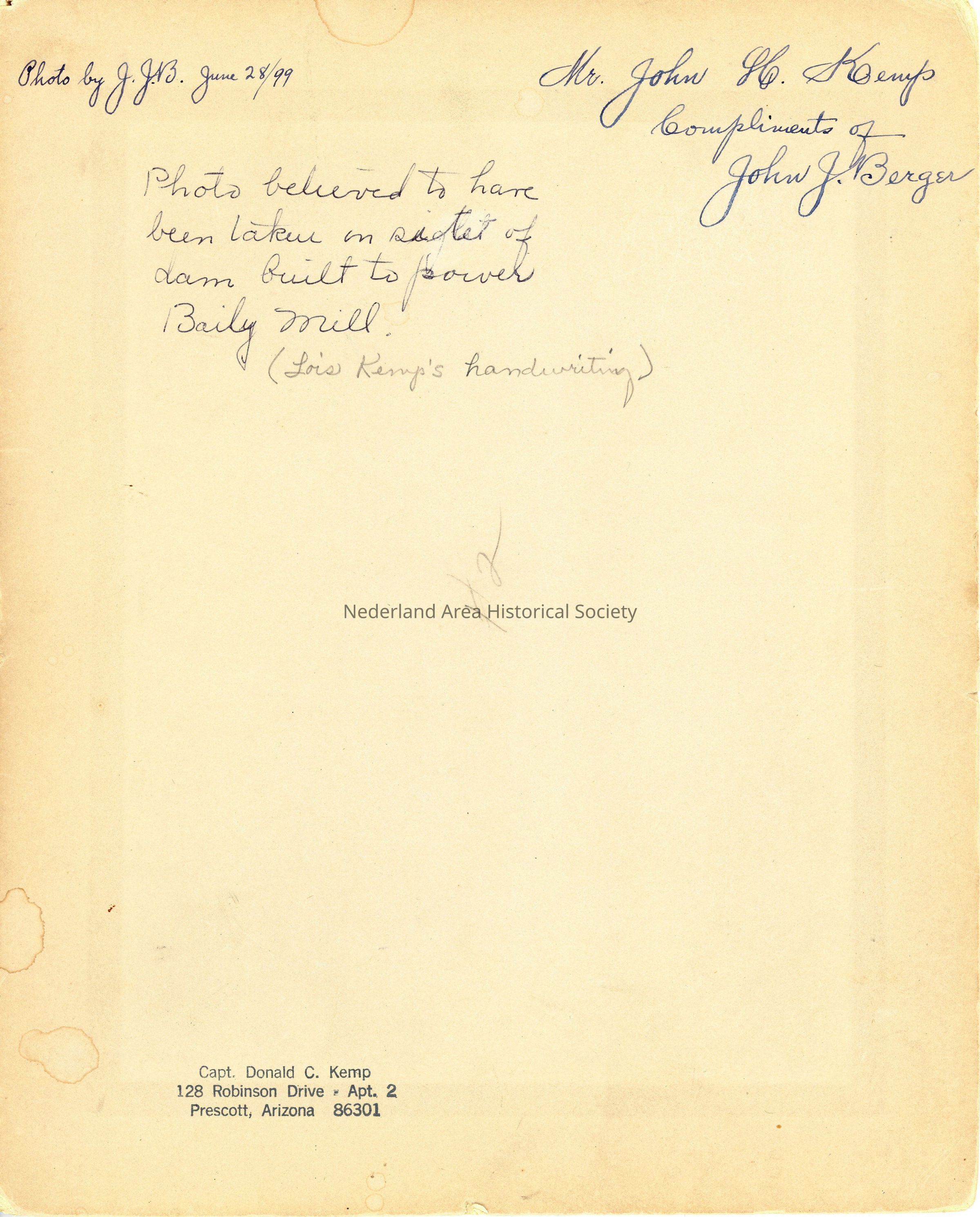 Photo believed to have been taken on site of dam built to power Baily Mill in Eldora, Colo. Photo was given to John H. Kemp by John J. Berger. Photo by J.J.B. (Berger) June 28, 1899.Collection